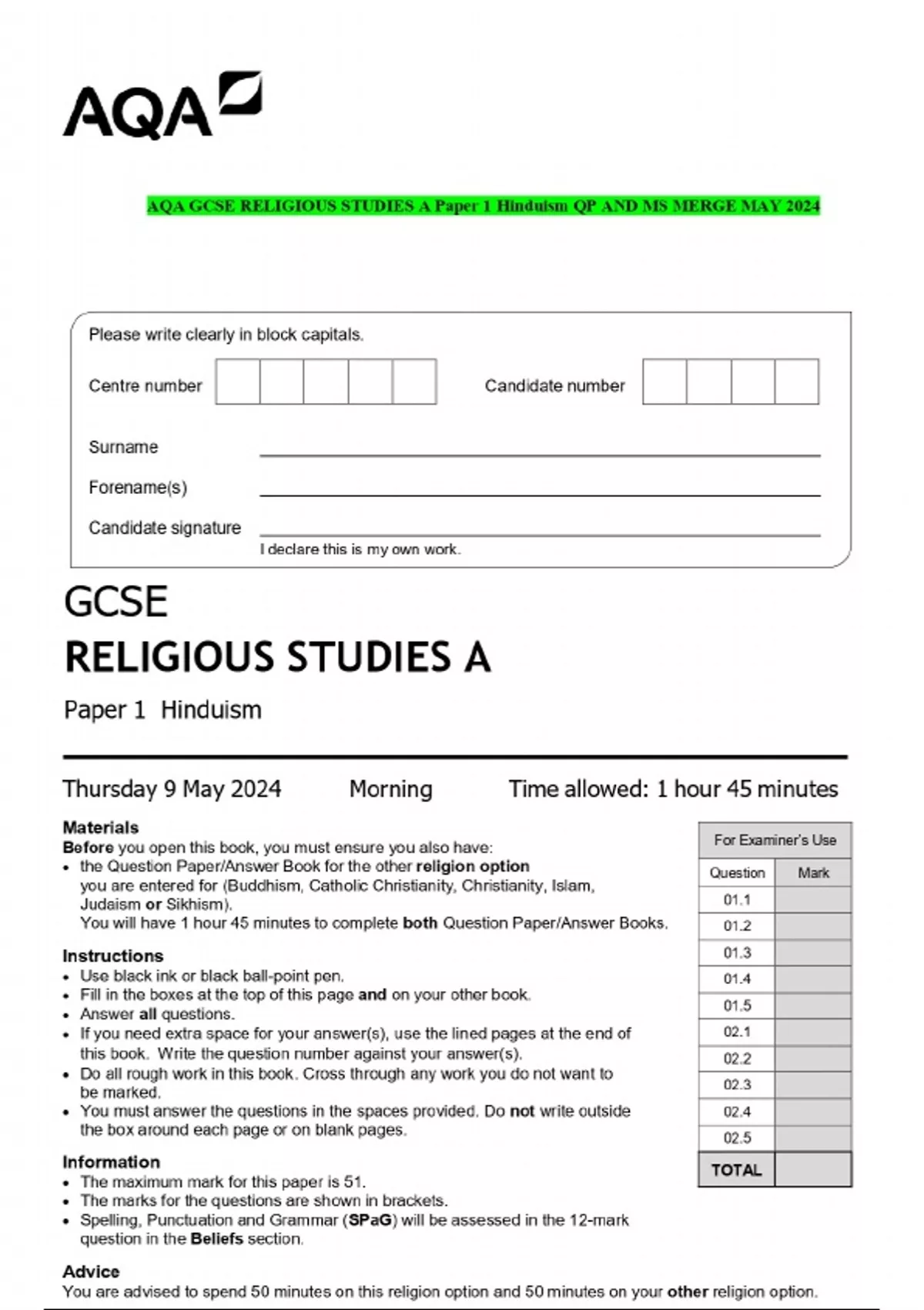 AQA GCSE RELIGIOUS STUDIES A Paper 1 Hinduism QP AND MS MERGE MAY 2024