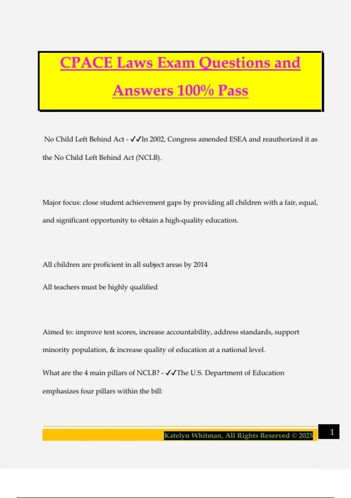 CPACE Laws Exam Questions and Answers 100% Pass No Child Left Behind Act - In 2002, Congress amended ESEA and reauthorized it as the No Child Left Behind Act (NCLB). Major focus: close student achievement gaps by providing all children with a fair, equal, and significant opportunity to obtain a high-quality education. All children are proficient in all subject areas by 2014 All teachers must be highly qualified Aimed to: improve test scores, increase accountability, address standards, support minority population, & increase quality of education at a national level. What are the 4 main pillars of NCLB? - The U.S. Department of Education emphasizes four pillars within the bill: 2Katelyn Whitman, All Rights Reserved © 2025 Accountability: to ensure those students who are disadvantaged, achieve academic proficiency. Flexibility: Allows school districts flexibility in how they use federal education funds to improve student achievement. Research-based education: Emphasizes educational programs and practices that have been proven effective through scientific research. Parent options: Increases the choices available to the parents of students attending Title I schools. What is The Elementary and Secondary Education Act? - ESEA was passed in 1965 as a part of the "War on Poverty." (federal gov) ESEA emphasizes equal access to education and establishes high standards and accountability. Often used as a reference by schools when establishing programs for gifted/talented students. How many years of not meeting AYP triggers the School Improvement Phase? - After 2 years of not meeting AYP a school is eligible to receive $$ throught school Improvement grant under Title 1, Part A of NCLB. 3Katelyn Whitman, All Rights Reserved © 2025 How many main parts does IDEA have? - 4. Parts A&B = eligibility procedures, regulations and services for children 3-21. Part C = infants and toddlers under 3. Part D= activities promoted by the federal government that enhance eduation for individuals with disabilities. What does gifted and talented mean according to ESEA? - "students, children, or youth who give evidence of high achievement capability in areas such as intellectual, creative, artistic, or leadership capacity, or in specific academic fields, and who need services and activities not ordinarily provided but the school." What is The Goals 2000: Educate America Act - The goals stated in the Summary of Goals 2000 include: By the Year 2000... All children in America will start school ready to lear