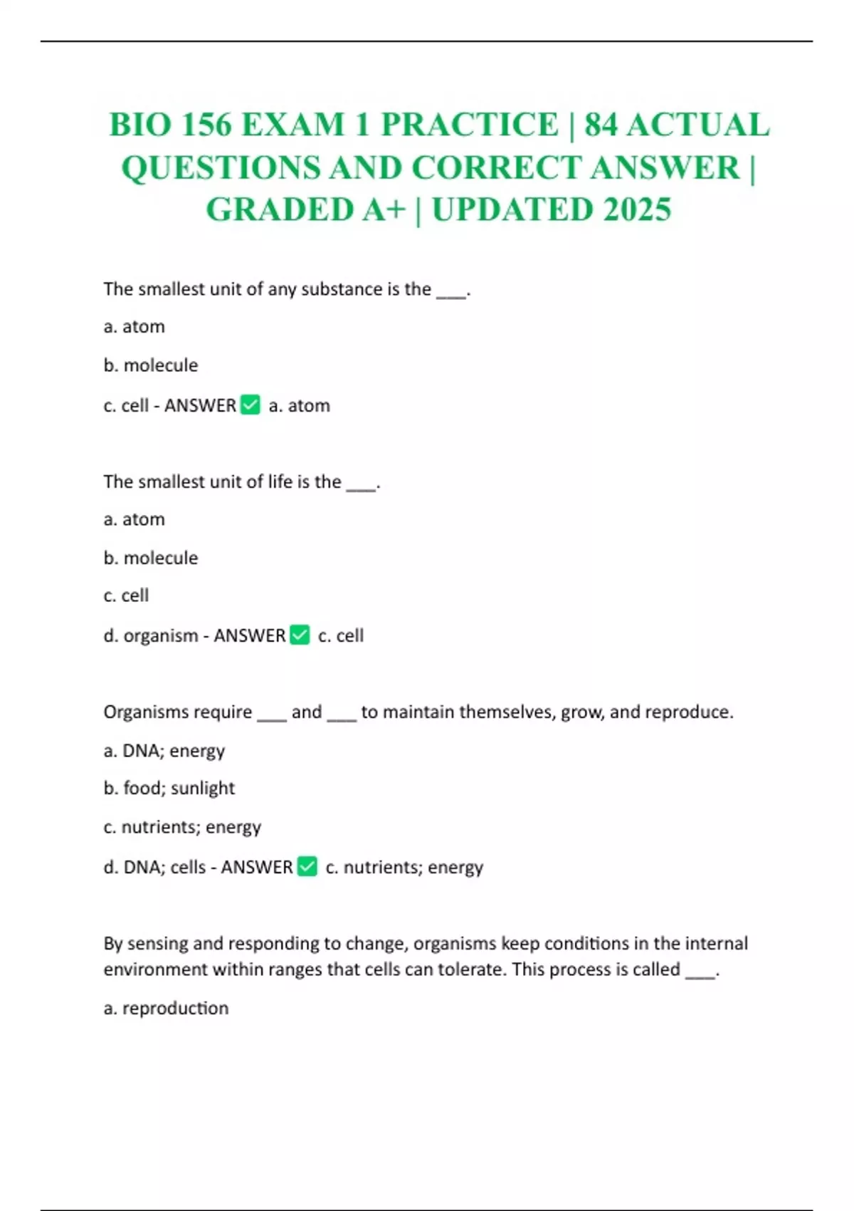 BIO 156 EXAM 1 PRACTICE | 84 ACTUAL QUESTIONS AND CORRECT ANSWER | GRADED A+ | UPDATED 2025