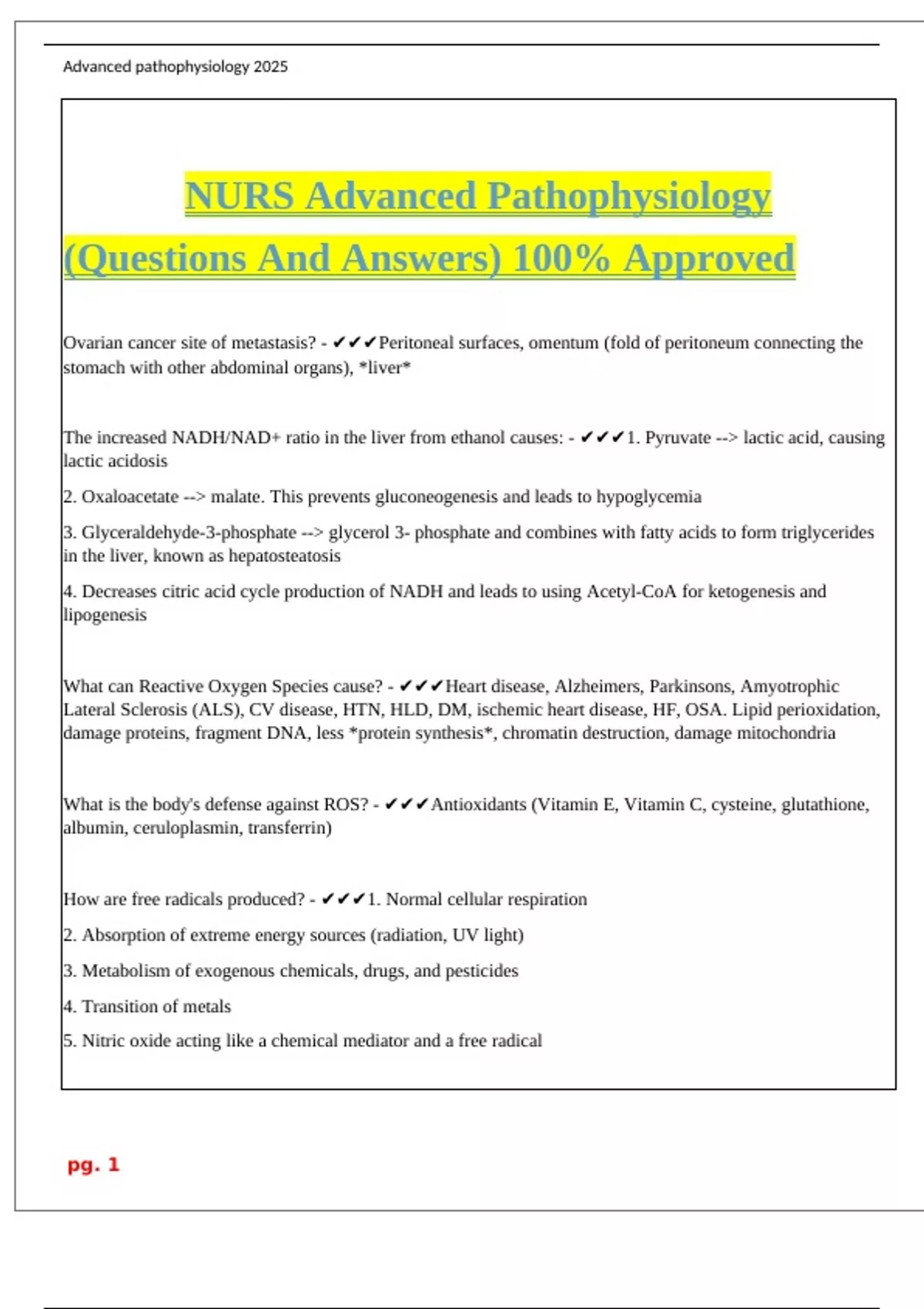 NURS Advanced Pathophysiology (Questions And Answers) 100% Approved
