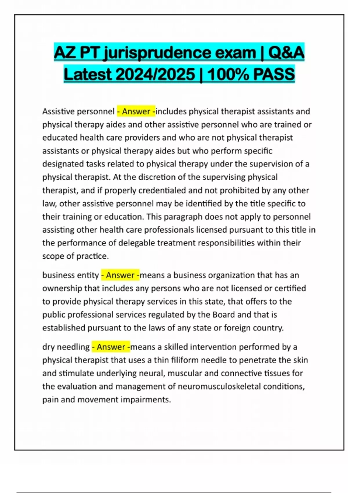 AZ PT jurisprudence exam | Q&A Latest 2024/2025 | 100% PASS Assistive personnel - Answer -includes physical therapist assistants and physical therapy aides and other assistive personnel who are trained or educated health care providers and who are not physical therapist assistants or physical therapy aides but who perform specific designated tasks related to physical therapy under the supervision of a physical therapist. At the discretion of the supervising physical therapist, and if properly credentialed and not prohibited by any other law, other assistive personnel may be identified by the title specific to their training or education. This paragraph does not apply to personnel assisting other health care professionals licensed pursuant to this title in the performance of delegable treatment responsibilities within their scope of practice. business entity - Answer -means a business organization that has an ownership that includes any persons who are not licensed or certified to provide physical therapy services in this state, that offers to the public professional services regulated by the Board and that is established pursuant to the laws of any state or foreign country. dry needling - Answer -means a skilled intervention performed by a physical therapist that uses a thin filifor