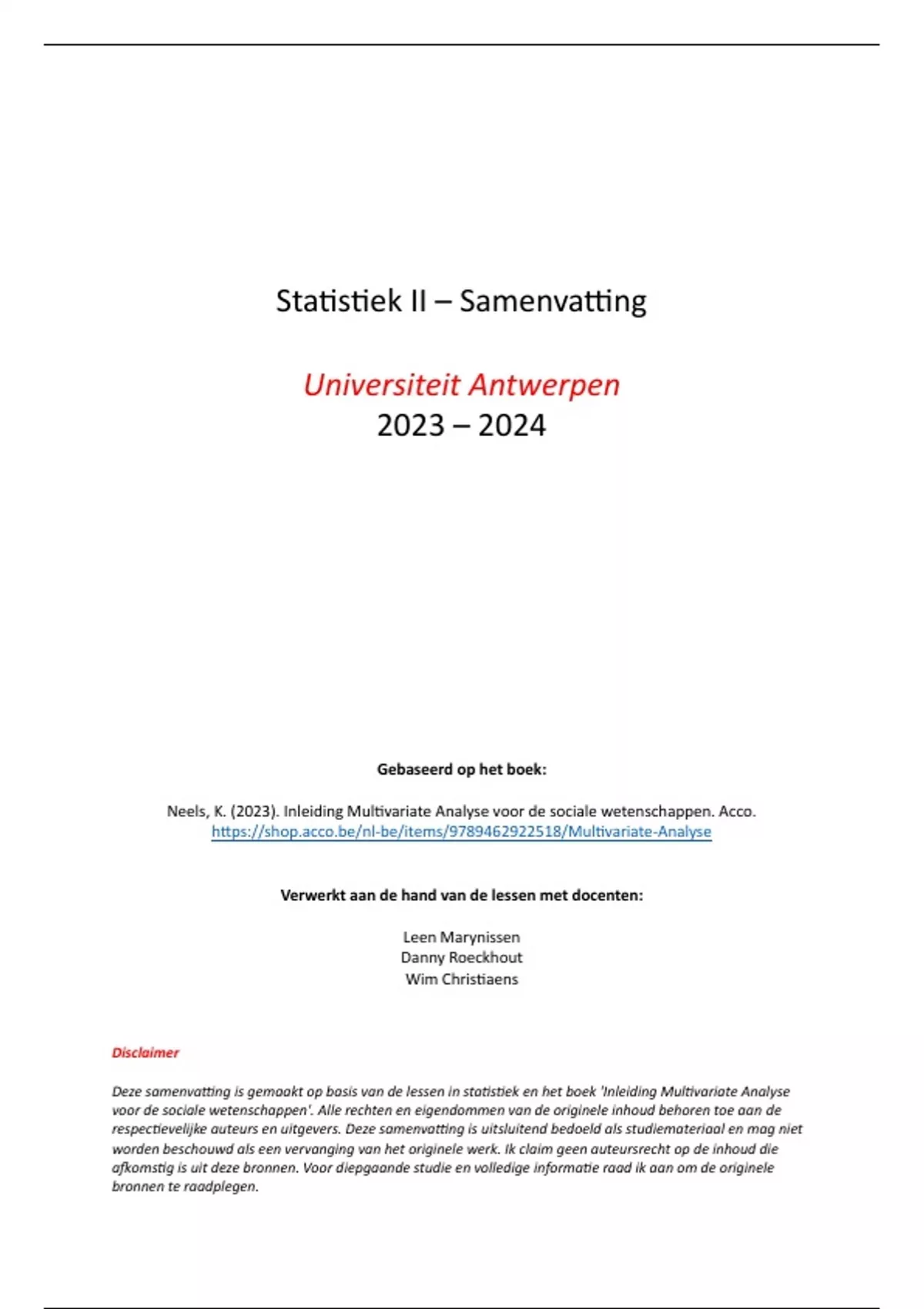 Deze samenvatting is gemaakt op basis van de lessen in statistiek en het boek 'Inleiding Multivariate Analyse