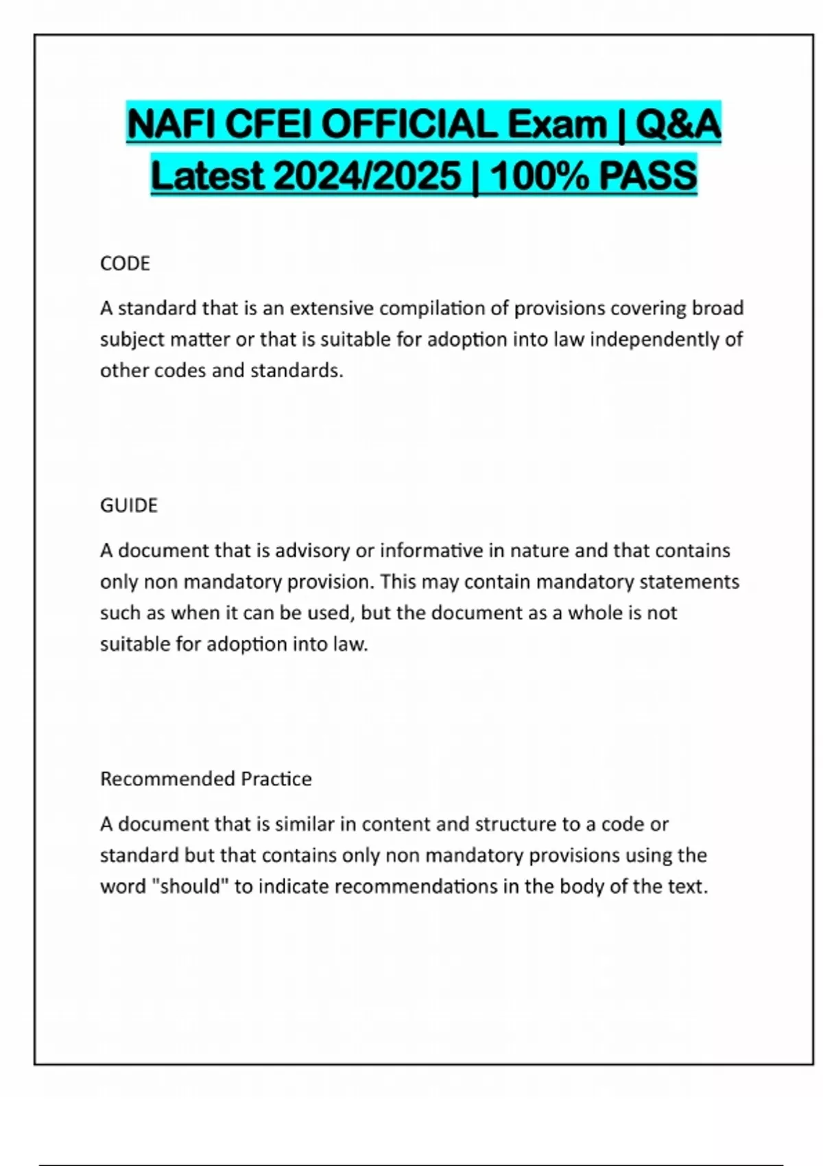 NAFI CFEI OFFICIAL Exam | Q&A Latest 2024/2025 | 100% PASS CODE A standard that is an extensive compilation of provisions covering broad subject matter or that is suitable for adoption into law independently of other codes and standards. GUIDE A document that is advisory or informative in nature and that contains only non mandatory provision. This may contain mandatory statements such as when it can be used, but the document as a whole is not suitable for adoption into law. Recommended Practice A document that is similar in content and structure to a code or standard but that contains only non mandatory provisions using the word "should" to indicate