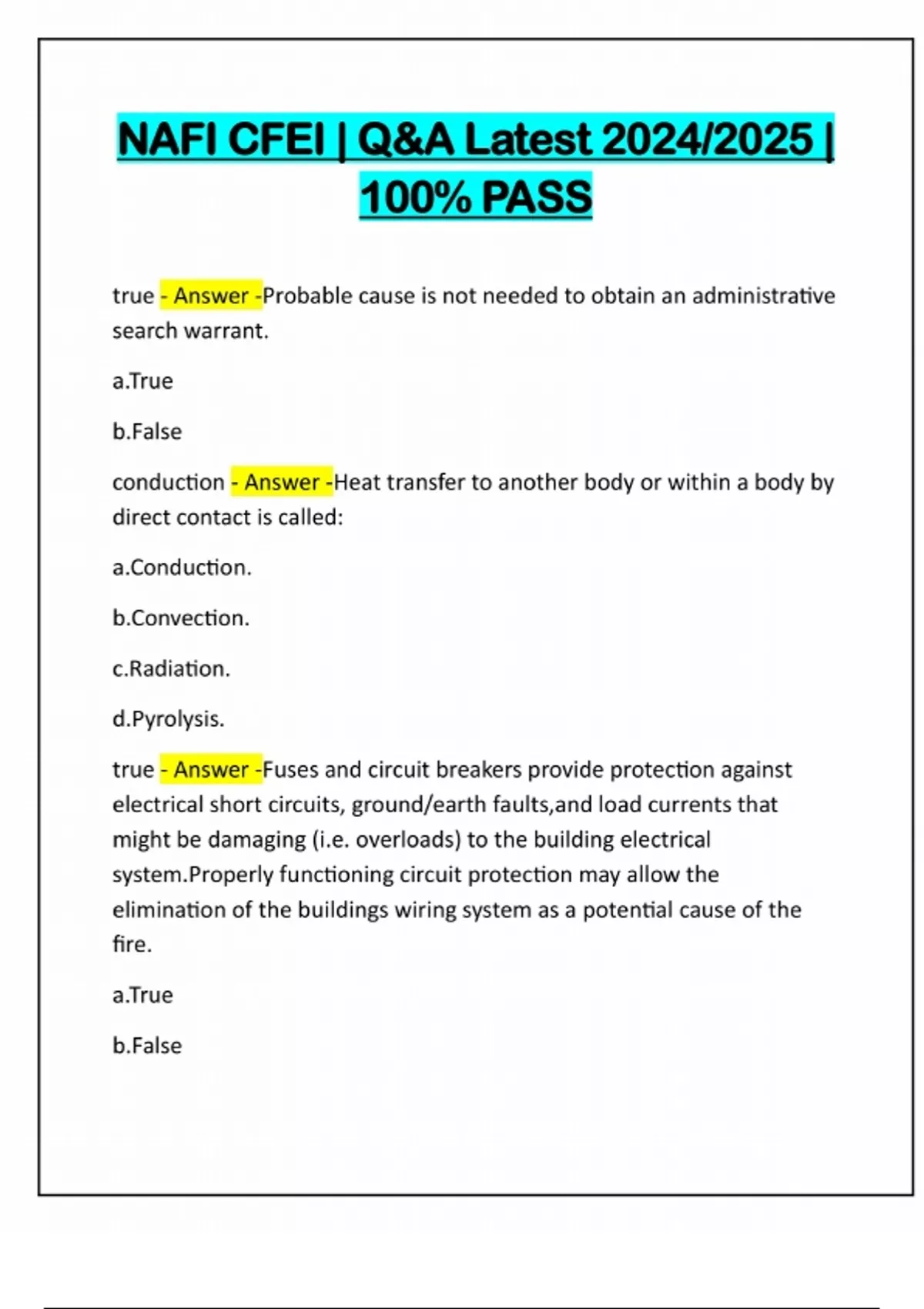 NAFI CFEI | Q&A Latest 2024/2025 | 100% PASS true - Answer -Probable cause is not needed to obtain an administrative search warrant. a.True b.False conduction - Answer -Heat transfer to another body or within a body by direct contact is called: a.Conduction. b.Convection. c.Radiation. d.Pyrolysis. true - Answer -Fuses and circuit breakers provide protection against electrical short circuits, ground/earth faults,and load currents that might be damaging (i.e. overloads) to the building electrical system.Properly functioning circuit protection may allow the elimination of the buildings wiring system as a potential cause of the fire. a.True b.False