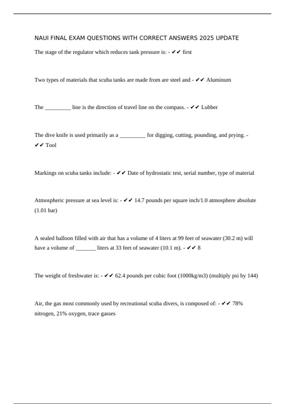 Air, the gas most commonly used by recreational scuba divers, is composed of: - ✔✔ 78%
