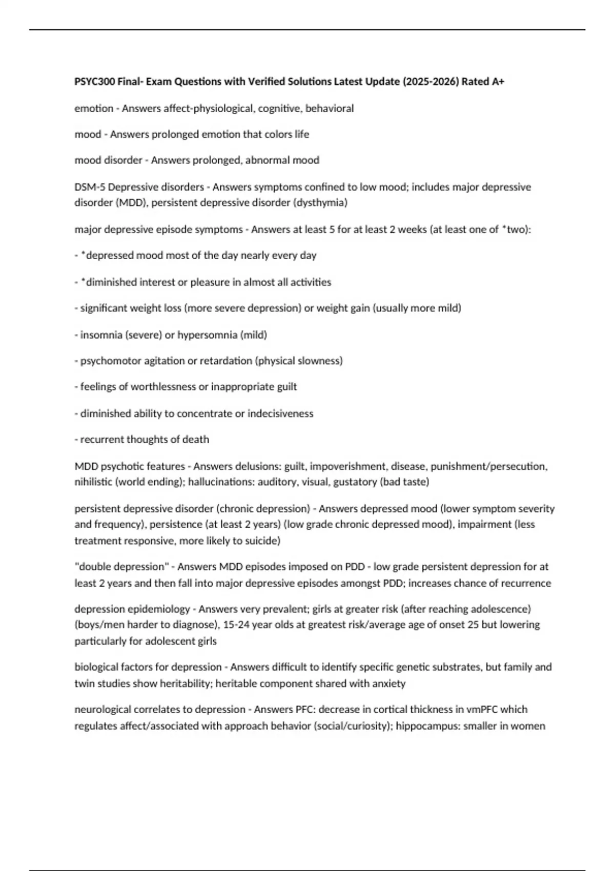 PSYC300 Final- Exam Questions with Verified Solutions Latest Update () Rated A+ emotion - Answers affect-physiological, cognitive, behavioral mood - Answers prolonged emotion that colors life mood disorder - Answers prolonged, abnormal mood DSM-5 Depressive disorders - Answers symptoms confined to low mood; includes major depressive disorder (MDD), persistent depressive disorder (dysthymia) major depressive episode symptoms - Answers at least 5 for at least 2 weeks (at least one of *two): - *depressed mood most of the day nearly every day - *diminished interest or pleasure in almost all activities - significant weight loss (more severe depression) or weight gain (usually more mild) - insomnia (severe) or hypersomnia (mild) - psychomotor agitation or retardation (physical slowness) - feelings of worthlessness or inappropriate guilt - diminished ability to concentrate or indecisiveness - recurrent thoughts of death MDD psychotic features - Answers delusions: guilt, impoverishment, disease, punishment/persecution, nihilistic (world ending); hallucinations: auditory, visual, gustatory (bad taste) persistent depressive disorder (chronic depression) - Answers depressed mood (lower symptom severity and frequency), persistence (at least 2 years) (low grade chronic depressed mood), impairment (less treatment responsive, more likely to suicide) "double depression" - Answers MDD episodes imposed on PDD - low grade persistent depression for at least 2 years and then fall into major depressive episodes amongst PDD; increases chance of recurrence depression epidemiology - Answers very prevalent; girls at greater risk (after reaching adolescence) (boys/men harder to diagnose), 15-24 year olds at greatest risk/average age of onset 25 but lowering particularly for adolescent girls biological factors for depression - Answers difficult to identify specific genetic substrates, but family and twin studies show heritability; heritable component shared with anxiety neurological correlates to depression - Answers PFC: decrease in cortical thickness in vmPFC which regulates affect/associated with approach behavior (social/curiosity); hippocampus: smaller in women with MDD, may be result of stress; decreased activity in anterior cingulate cortex (connects amygdala and PFC); stress increases dendrite branching and reactivity in amygdala biochemical/neuroendocrine models of depression - Answers neurotransmitter dysregulation; serotonin low compared to dopamine and norepinephrine; chronically elevated HPA activation (stressful life events) results in dysregulation of glutamate circuits biological treatments for depression - Answers tricyclics and tetracyclics (TCAs), MAO-inhibitors, serotonin reuptake inhibitors (SSRIs, SNRIs) (some fewer side effects to TCAs but similar effectiveness), ketamine infusions (up regulates biochemicals (glutamate) that promote neural growth); exercise (effective in mild to moderate cases) (may increase effectiveness of pharmacotherapy) electroshock therapy (EST) - Answers depression treatment best alternative for those not responsive to other treatments; much safer now (limited sessions and muscle relaxants); may cause short term memory loss but usually remits within 2 weeks social contributors to depression - Answers stressful life events, interpersonal events interpersonal psychotherapy (IPT) - Answers works on person's current interpersonal problems: role disputes (marital conflict), relationship loss, relationship initiation, deficient social skills depression cognitive processes - Answers shoulds, self criticism, negative social comparisons, arbitrary inference, overgeneralization, selective abstraction (judging event by one specific negative moment/interaction), activation of negative schema cognitive therapy - Answers automatic thought records, behavioral experiments, goal: