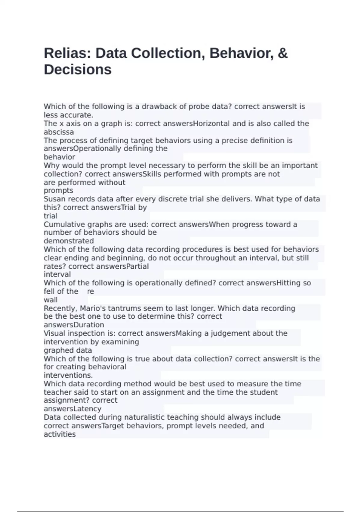 answersTarget behaviors, prompt levels needed, and