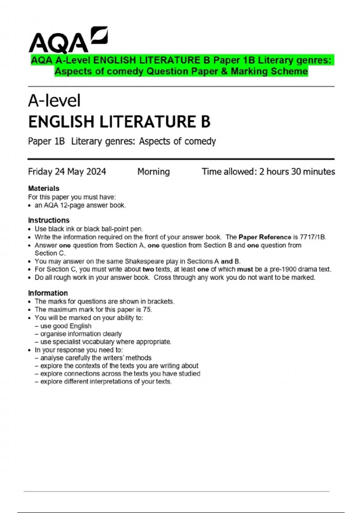 AQA A-Level ENGLISH LITERATURE B Paper 1B Literary genres: Aspects of comedy Question Paper & Marking Scheme