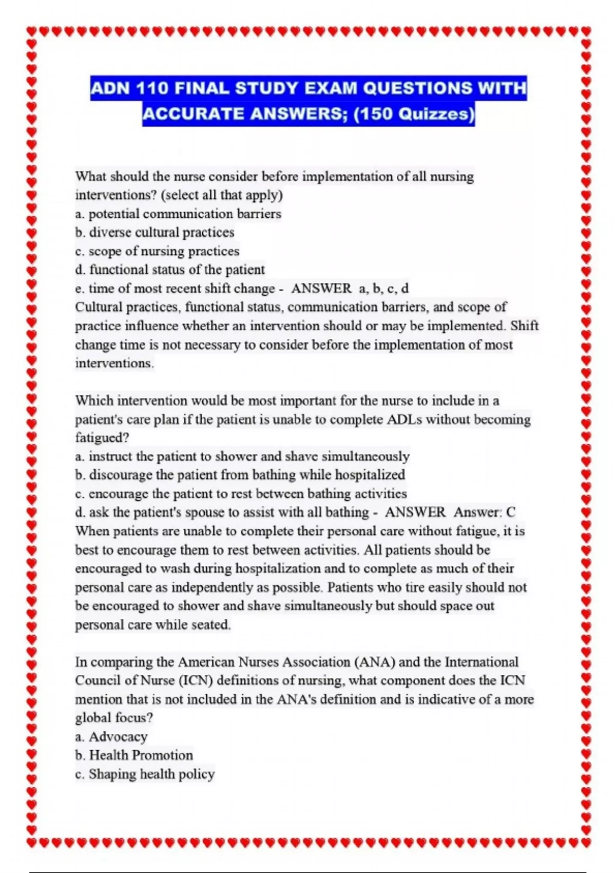 ADN 110 FINAL STUDY EXAM QUESTIONS WITH ACCURATE ANSWERS; (150 Quizzes)