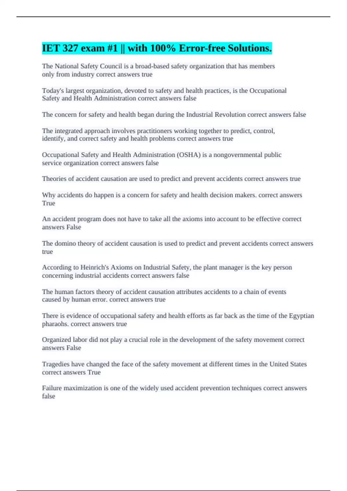 The National Safety Council is a broad-based safety organization that has members only from industry correct answers true Today's largest organization, devoted to safety and health practices, is the Occupational Safety and Health Administration correct answers false The concern for safety and health began during the Industrial Revolution correct answers false The integrated approach involves practitioners working together to predict, control, identify, and correct safety and health problems correct answers true Occupational Safety and Health Administration (OSHA) is a nongovernmental public service organization correct answers false Theories of accident causation are used to predict and prevent accidents correct answers true Why accidents do happen is a concern for safety and health decision makers. correct answers True An accident program does not have to take all the axioms into account to be effective correct answers False The domino theory of accident causation is used to predict and prevent accidents correct answers true According to Heinrich's Axioms on Industrial Safety, the plant manager is the key person concerning industrial accidents correct answers false The human factors theory of accident causation attributes accidents to a chain of events caused by human error. correct answers true There is evidence of occupational safety and health efforts as far back as the time of the Egyptian pharaohs. correct answers true Organized labor did not play a crucial role in the development of the safety movement correct answers False Tragedies have changed the face of the safety movement at different times in the United States correct answers True Failure maximization is one of the widely used accident prevention techniques correct answers false