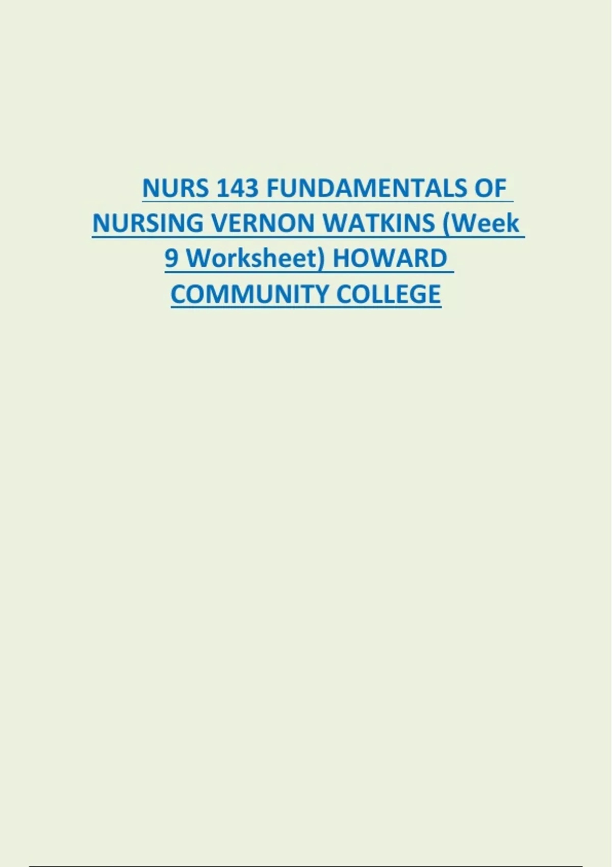 NURS 143 FUNDAMENTALS OF NURSING VERNON WATKINS (Week 9 Worksheet) HOWARD COMMUNITY COLLEGE