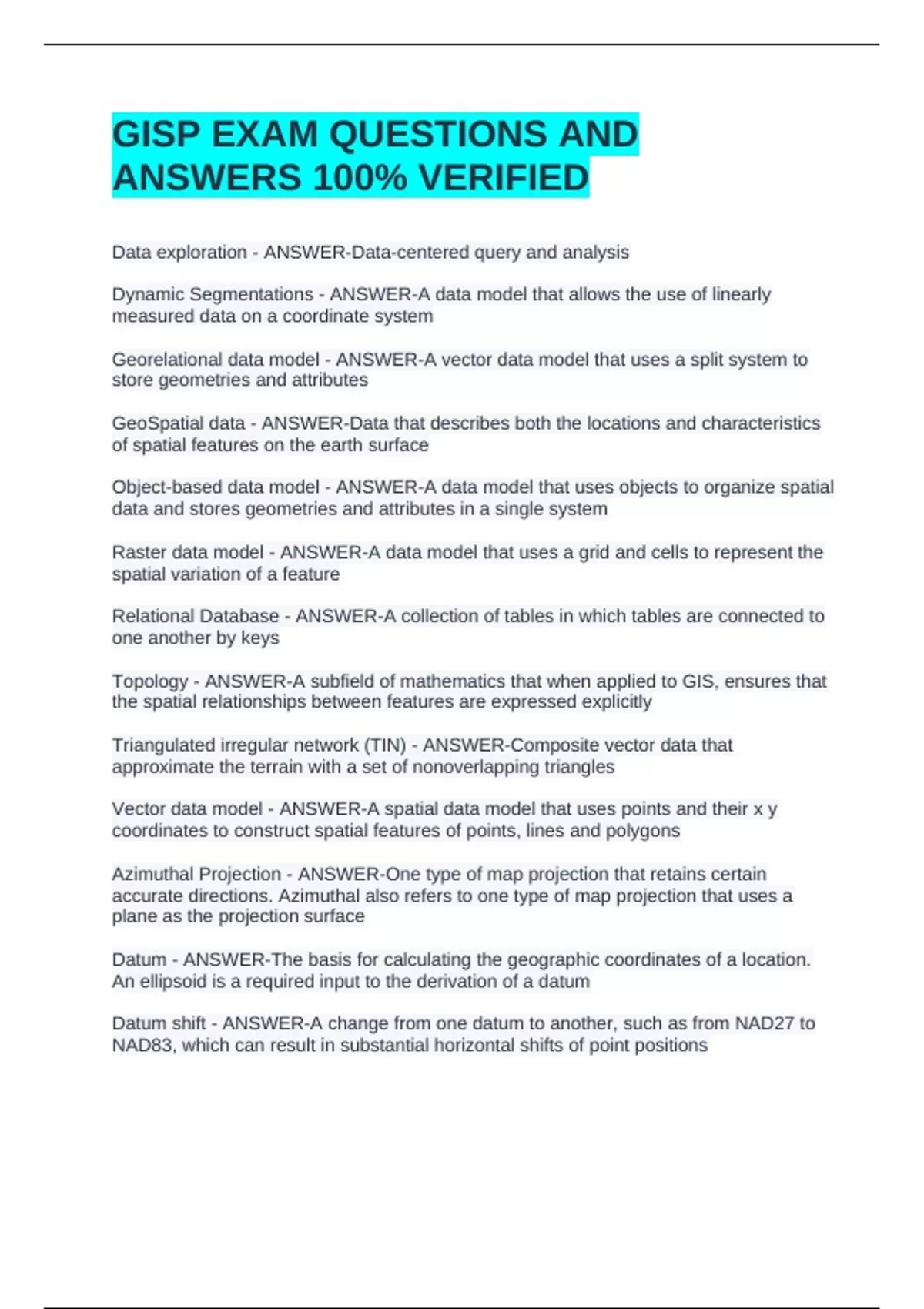 GISP EXAM QUESTIONS AND ANSWERS 100% VERIFIEDGISP EXAM QUESTIONS AND ANSWERS 100% VERIFIEDGISP EXAM QUESTIONS AND ANSWERS 100% VERIFIEDGISP EXAM QUESTIONS AND ANSWERS 100% VERIFIED Data exploration - ANSWER-Data-centered query and analysis Dynamic Segmentations - ANSWER-A data model that allows the use of linearly measured data on a coordinate system Georelational data model - ANSWER-A vector data model that uses a split system to store geometries and attributes GeoSpatial data - ANSWER-Data that describes both the locations and characteristics of spatial features on the earth surface