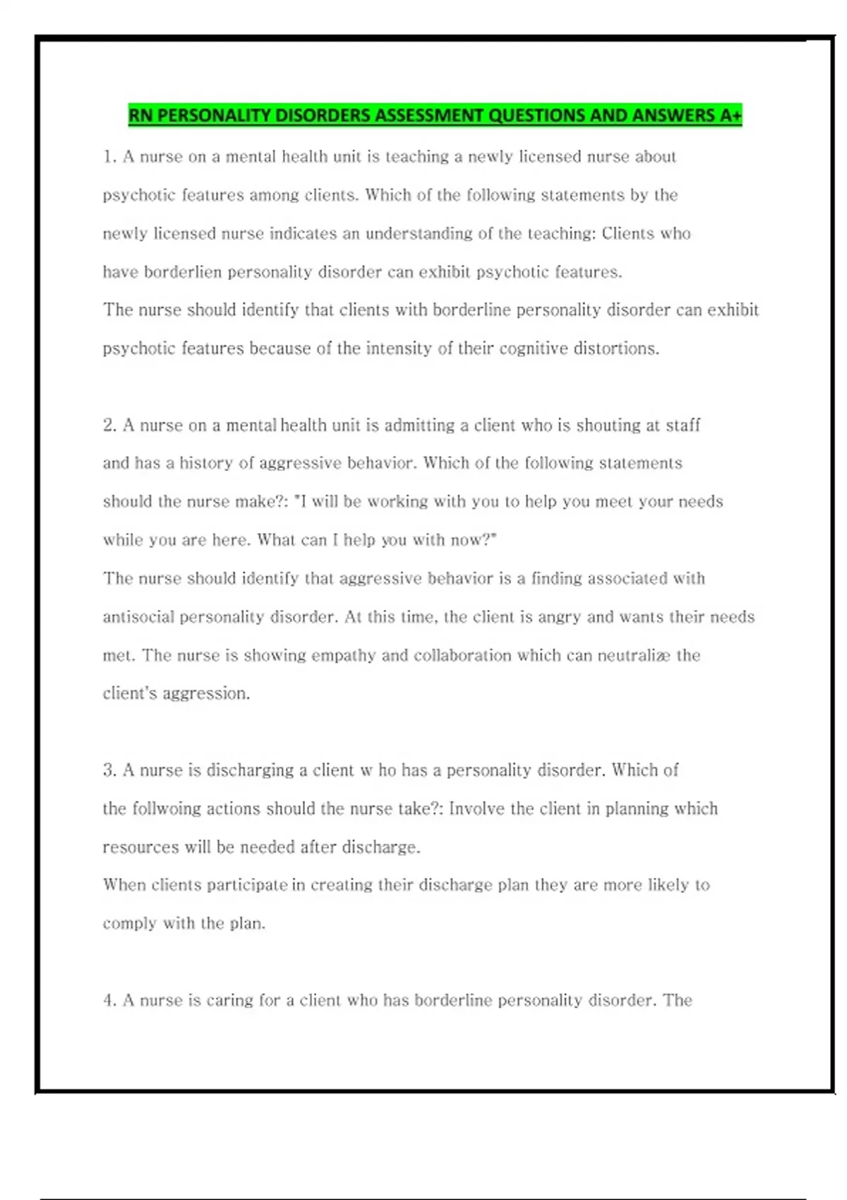 RN PERSONALITY DISORDERS ASSESSMENT QUESTIONS AND ANSWERS A+ 1. A nurse on a mental health unit is teaching a newly licensed nurse about psychotic features among clients. Which of the following statements by the newly licensed nurse indicates an understanding of the teaching: Clients who have borderlien personality disorder can exhibit psychotic features. The nurse should identify that clients with borderline personality disorder can exhibit psychotic features because of the intensity of their cognitive distortions. 2. A nurse on a mental health unit is admitting a client who is shouting at staff and has a history of aggressive behavior. Which of the following statements should the nurse make?: "I will be working with you to help you meet your needs while you are here. What can I help you with now?" The nurse should identify that aggressive behavior is a finding associated with antisocial personality disorder. At this time, the client is angry and wants their needs met. The nurse is showing empathy and collaboration which can neutralize the client's aggression. 3. A nurse is discharging a client w ho has a personality disorder. Which of the follwoing actions should the nurse take?: Involve the client in planning which resources will be needed after discharge. When clients participate in creating their discharge plan they are more likely to comply with the plan. 4. A nurse is caring for a client who has borderline personality disorder. The nurse should identify that which of the following factors may have contributed to the development of this diosrder?: Childhood rejection The nurse should identify that exposure to traumatic events during childhood, such as fear of rejection and/or abandonment, are contributing factors for the development of borderline personality disorder. 5. 0900:Client brought to the emergency department via EMS after their part ner called emergency services due to client threating to shoot themself.