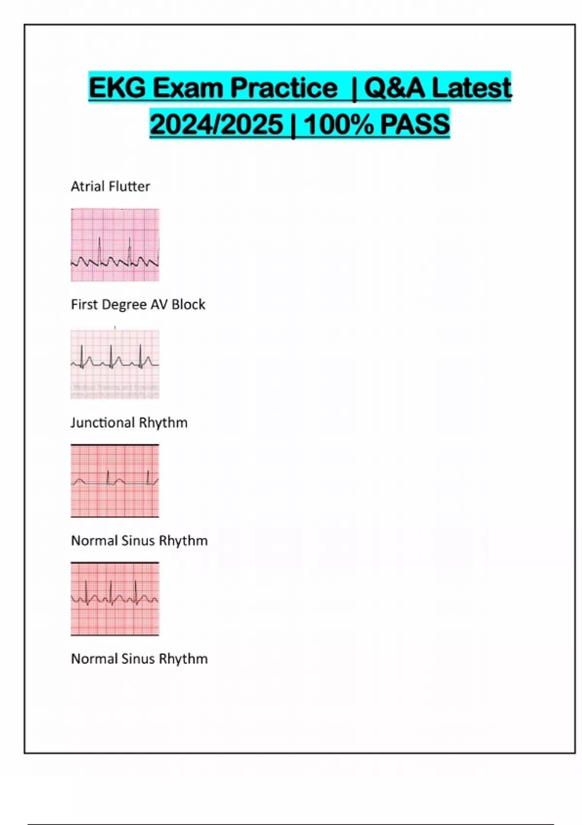 EKG Exam Practice | Q&A Latest 2024/2025 | 100% PASS Atrial Flutter First Degree AV Block Junctional Rhythm Normal Sinus Rhythm Normal Sinus RhythmSecond Degree AV Block, Type 2 Second Degree AV Block, Type 2 Sinus Arrhythmia