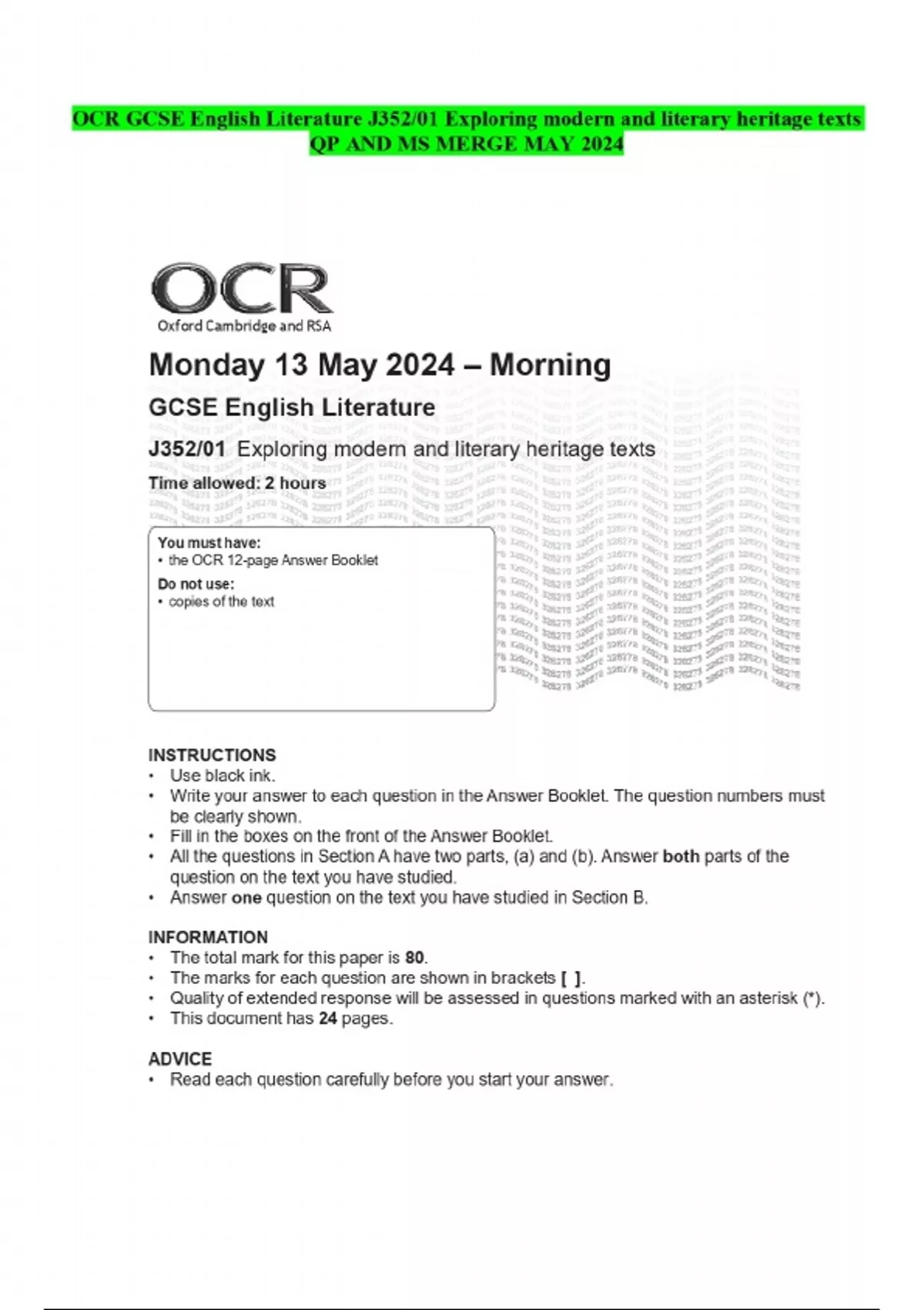 OCR GCSE English Literature J352/01 Exploring modern and literary heritage texts QP AND MS MERGE MAY 2024