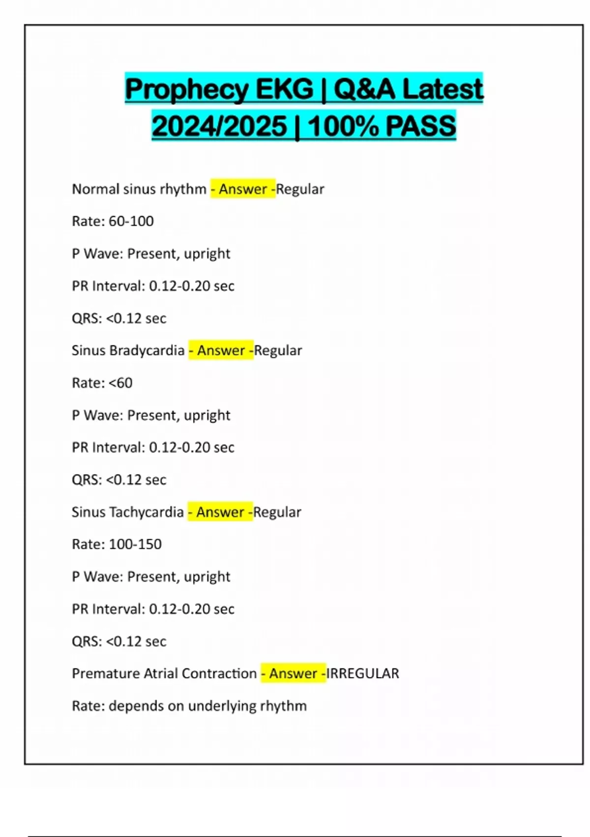 Prophecy EKG | Q&A Latest 2024/2025 | 100% PASS Normal sinus rhythm - Answer -Regular Rate: 60-100 P Wave: Present, upright PR Interval: 0.12-0.20 sec QRS: <0.12 sec Sinus Bradycardia - Answer -Regular Rate: <60 P Wave: Present, upright PR Interval: 0.12-0.20 sec QRS: <0.12 sec Sinus Tachycardia - Answer -Regular Rate: 100-150 P Wave: Present, upright PR Interval: 0.12-0.20 sec QRS: <0.12 sec Premature Atrial Contraction - Answer -IRREGULAR Rate: depends on underlying rhythmP wave: Present or hidden in T wave PR Interval: 0.12-0.20 sec QRS: <0.12 sec Atrial Fibrillation - Answer -IRREGULAR Atrial rate: UNMEASURABLE Ventricular rate: variable P wave: unable to see