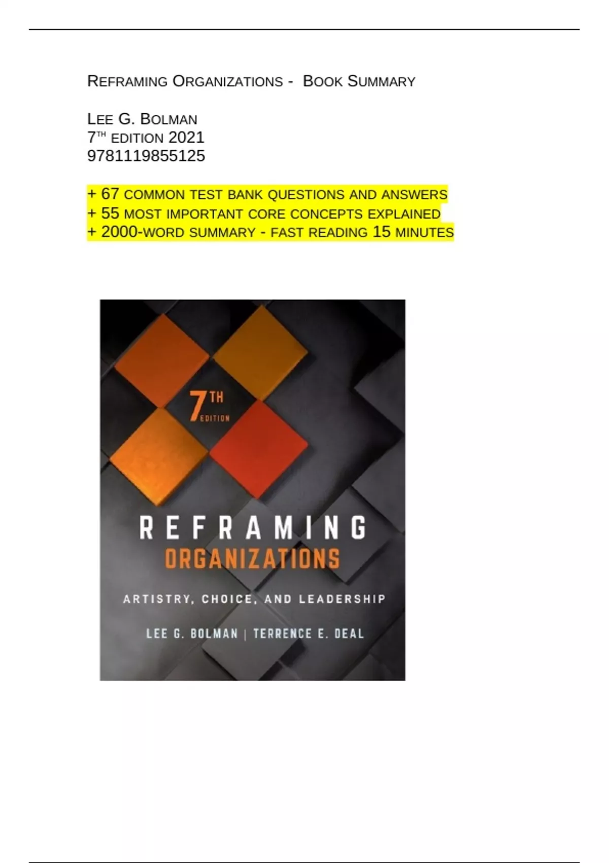 Book Summary REFRAMING ORGANIZATIONS LEE G. BOLMAN 7TH EDITION + Test bank + core concepts + 2000 word fast-reading summary