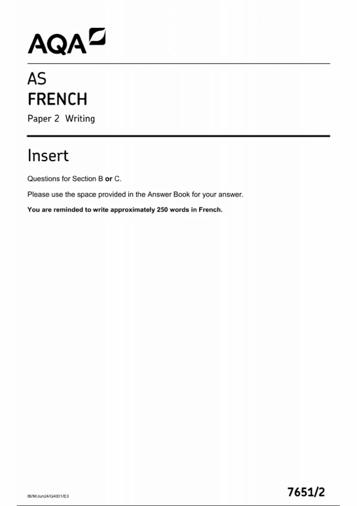 AQA AS FRENCH INSERT PAPER 1 2024(7651/2 :Writing)