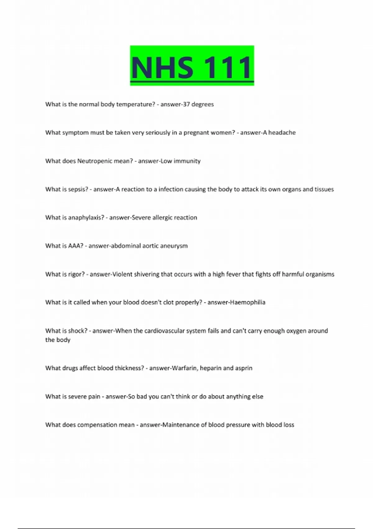 NHS 111 What is the normal body temperature? - answer-37 degrees What symptom must be taken very seriously in a pregnant women? - answer-A headache What does Neutropenic mean? - answer-Low immunity What is sepsis? - answer-A reaction to a infection causing the body to attack its own organs and tissues What is anaphylaxis? - answer-Severe allergic reaction What is AAA? - answer-abdominal aortic aneurysm What is rigor? - answer-Violent shivering that occurs with a high fever that fights off harmful organisms What is it called when your blood doesn't clot properly? - answer-Haemophilia What is shock? - answer-When the cardiovascular system fails and can't carry enough oxygen around the body What drugs affect blood thickness? - answer-Warfarin, heparin and asprin What is severe pain - answer-So bad you can't think or do about anything else What does compensation mean - answer-Maintenance of blood pressure with blood loss