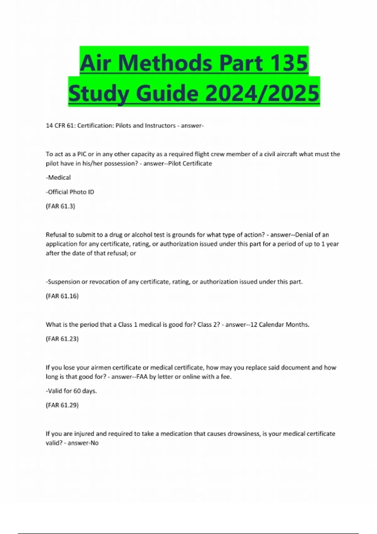 Air Methods Part 135 Study Guide 2024/2025 14 CFR 61: Certification: Pilots and Instructors - answerTo act as a PIC or in any other capacity as a required flight crew member of a civil aircraft what must the pilot have in his/her possession? - answer--Pilot Certificate -Medical -Official Photo ID (FAR 61.3) Refusal to submit to a drug or alcohol test is grounds for what type of action? - answer--Denial of an application for any certificate, rating, or authorization issued under this part for a period of up to 1 year after the date of that refusal; or -Suspension or revocation of any certificate, rating, or authorization issued under this part. (FAR 61.16) What is the period that a Class 1 medical is good for? Class 2? - answer--12 Calendar Months. (FAR 61.23) If you lose your airmen certificate or medical certificate, how may you replace said document and how long is that good for? - answer--FAA by letter or online with a fee. -Valid for 60 days. (FAR 61.29) If you are injured and required to take a medication that causes drowsiness, is your medical certificate valid? - answer-No
