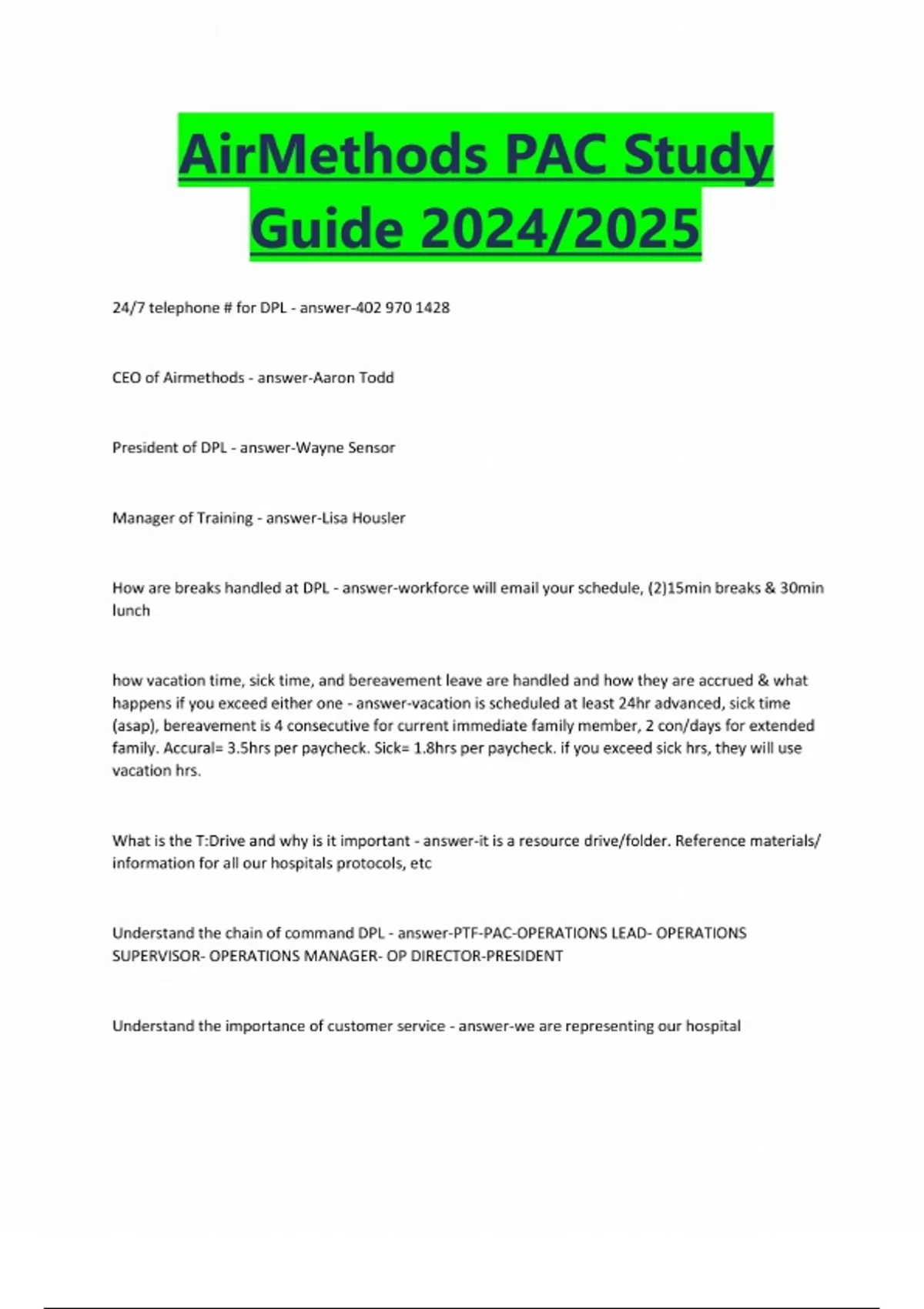 AirMethods PAC Study Guide 2024/2025 24/7 telephone # for DPL - answer- CEO of Airmethods - answer-Aaron Todd President of DPL - answer-Wayne Sensor Manager of Training - answer-Lisa Housler How are breaks handled at DPL - answer-workforce will email your schedule, (2)15min breaks & 30min lunch how vacation time, sick time, and bereavement leave are handled and how they are accrued & what happens if you exceed either one - answer-vacation is scheduled at least 24hr advanced, sick time (asap), bereavement is 4 consecutive for current immediate family member, 2 con/days for extended family. Accural= 3.5hrs per paycheck. Sick= 1.8hrs per paycheck. if you exceed sick hrs, they will use vacation hrs. What is the T:Drive and why is it important - answer-it is a resource drive/folder. Reference materials/ information for all our hospitals protocols, etc Understand the chain of command DPL - answer-PTF-PAC-OPERATIONS LEAD- OPERATIONS SUPERVISOR- OPERATIONS MANAGER- OP DIRECTOR-PRESIDENT