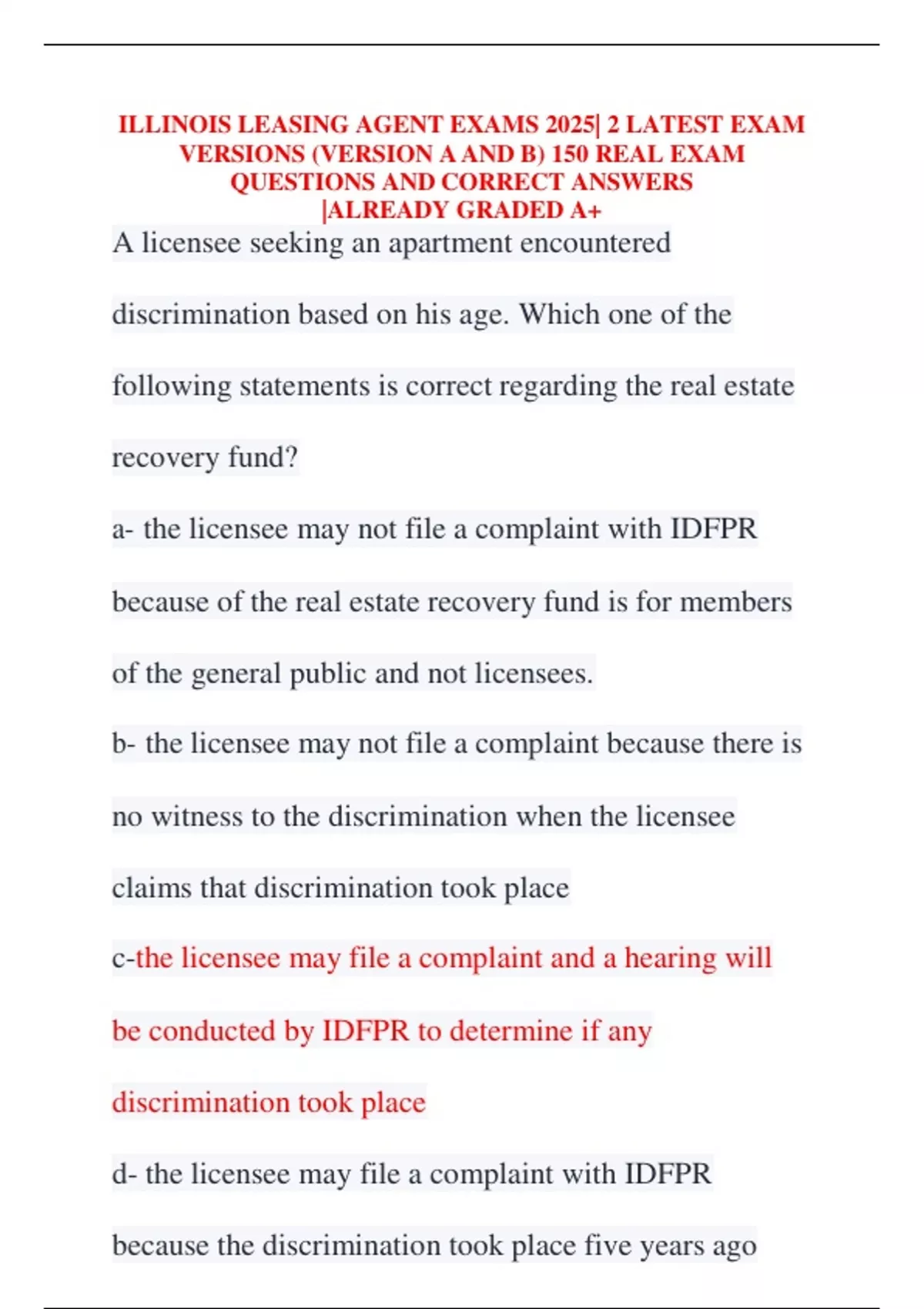 ILLINOIS LEASING AGENT EXAMS 2025| 2 LATEST EXAM VERSIONS (VERSION AAND B) 150 REAL EXAM QUESTIONS AND CORRECT ANSWERS |ALREADY GRADED A+