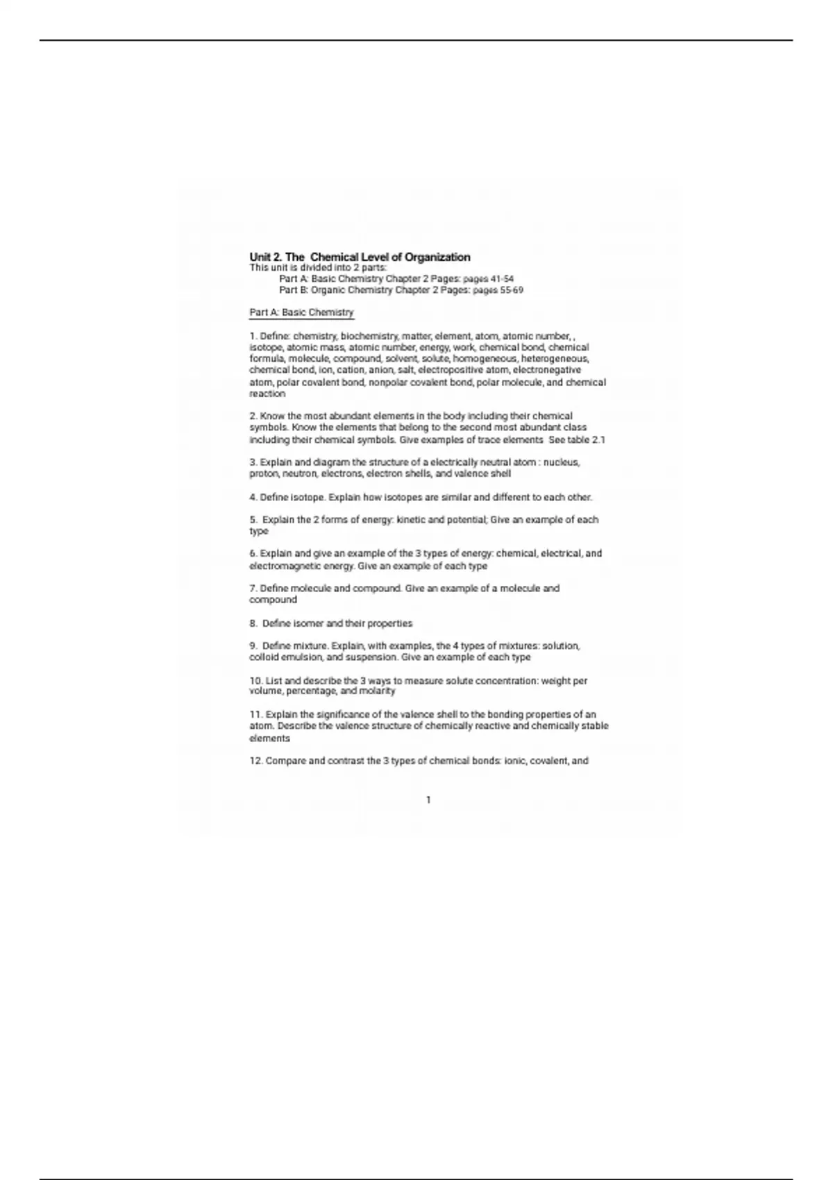 1. Define: chemistry, biochemistry, matter, element, atom, atomic number, ,