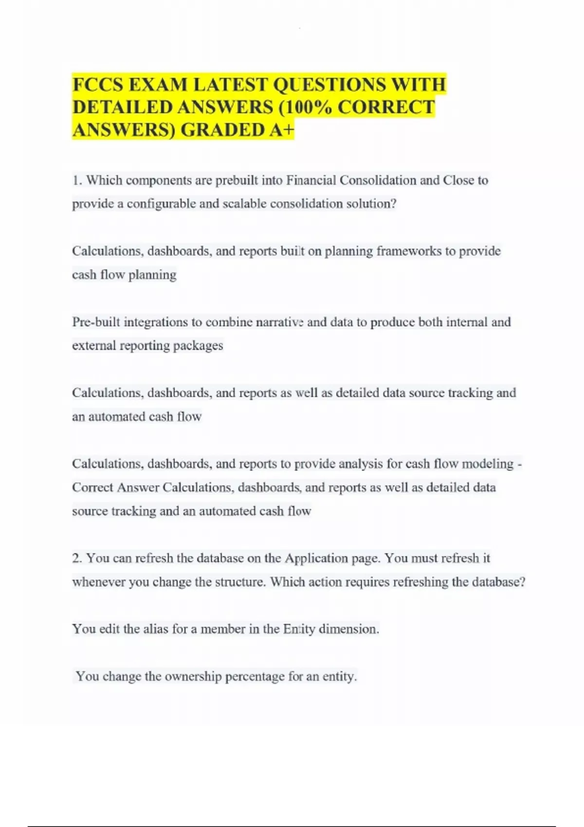 FCCS EXAM LATEST QUESTIONS WITH DETAILED ANSWERS (100% CORRECT ANSWERS) GRADED A+ 1. Which components are prebuilt into Financial Consolidation and Close to provide a configurable and scalable consolidation solution? Calculations, dashboards, and reports built on planning frameworks to provide cash flow planning Pre-built integrations to combine narrative and data to produce both internal and external reporting packages Calculations, dashboards, and reports as well as detailed data source tracking and an automated cash flow Calculations, dashboards, and reports to provide analysis for cash flow modeling - Correct Answer Calculations, dashboards, and reports as well as detailed data source tracking and an automated cash flow 2. You can refresh the database on the Application page. You must refresh it whenever you change the structure. Which action requires refreshing the database? You edit the alias for a member in the Entity dimension. You change the ownership percentage for an entity.