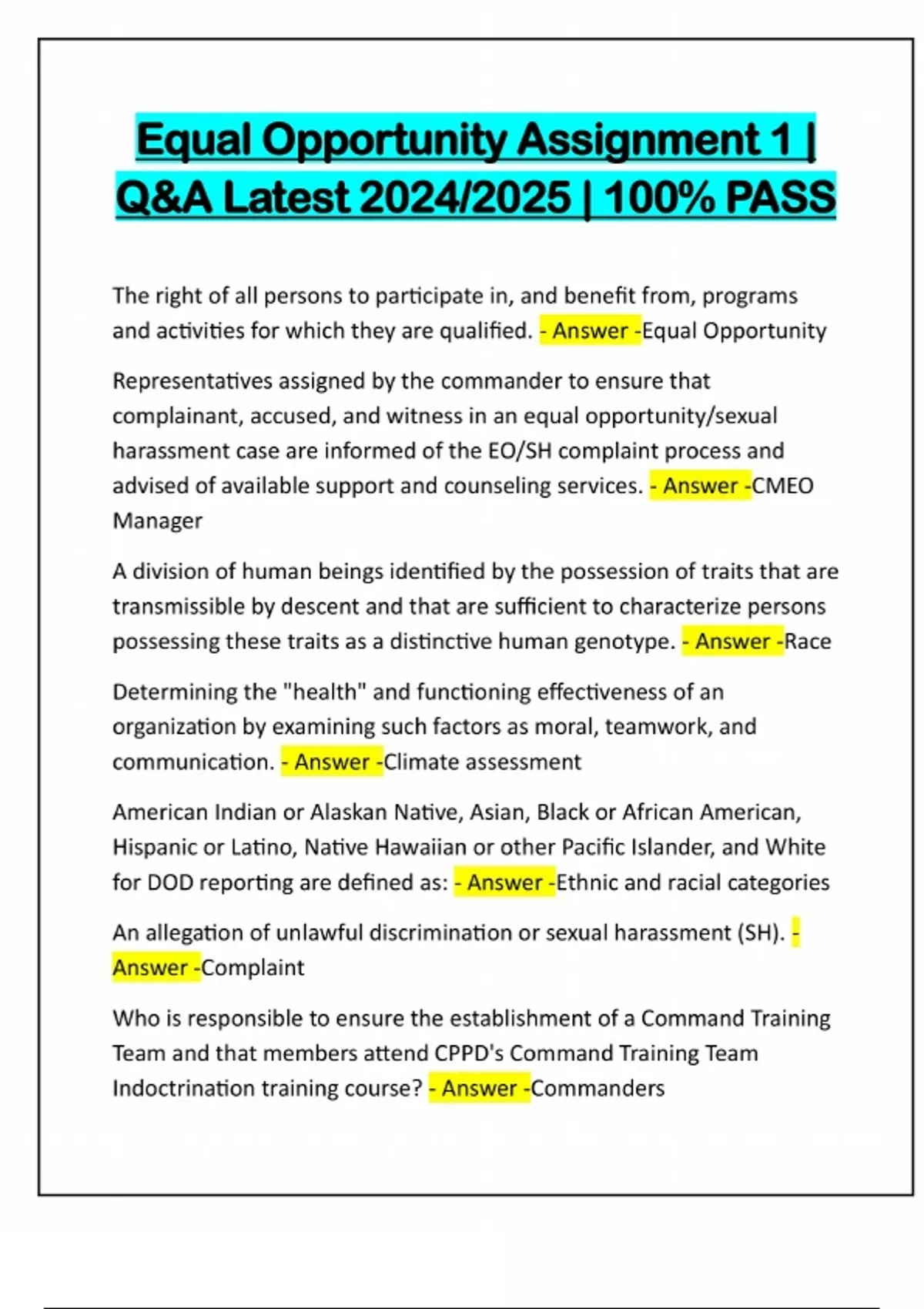 Equal Opportunity Assignment 1 | Q&A Latest 2024/2025 | 100% PASS The right of all persons to participate in, and benefit from, programs and activities for which they are qualified. - Answer -Equal Opportunity Representatives assigned by the commander to ensure that complainant, accused, and witness in an equal opportunity/sexual harassment case are informed of the EO/SH complaint process and advised of available support and counseling services. - Answer -CMEO Manager A division of human beings identified by the possession of traits that are transmissible by descent and that are sufficient to characterize persons possessing these traits as a distinctive human genotype. - Answer -Race Determining the "health" and functioning effectiveness of an organization by examining such factors as moral, teamwork, and communication. - Answer -Climate assessment American Indian or Alaskan Native, Asian, Black or African American, Hispanic or Latino, Native Hawaiian or other Pacific Islander, and White for DOD reporting are defined as: - Answer -Ethnic and racial categories An allegation of unlawful discrimination or sexual harassment (SH). - Answer -Complaint Who is responsible to ensure the establis