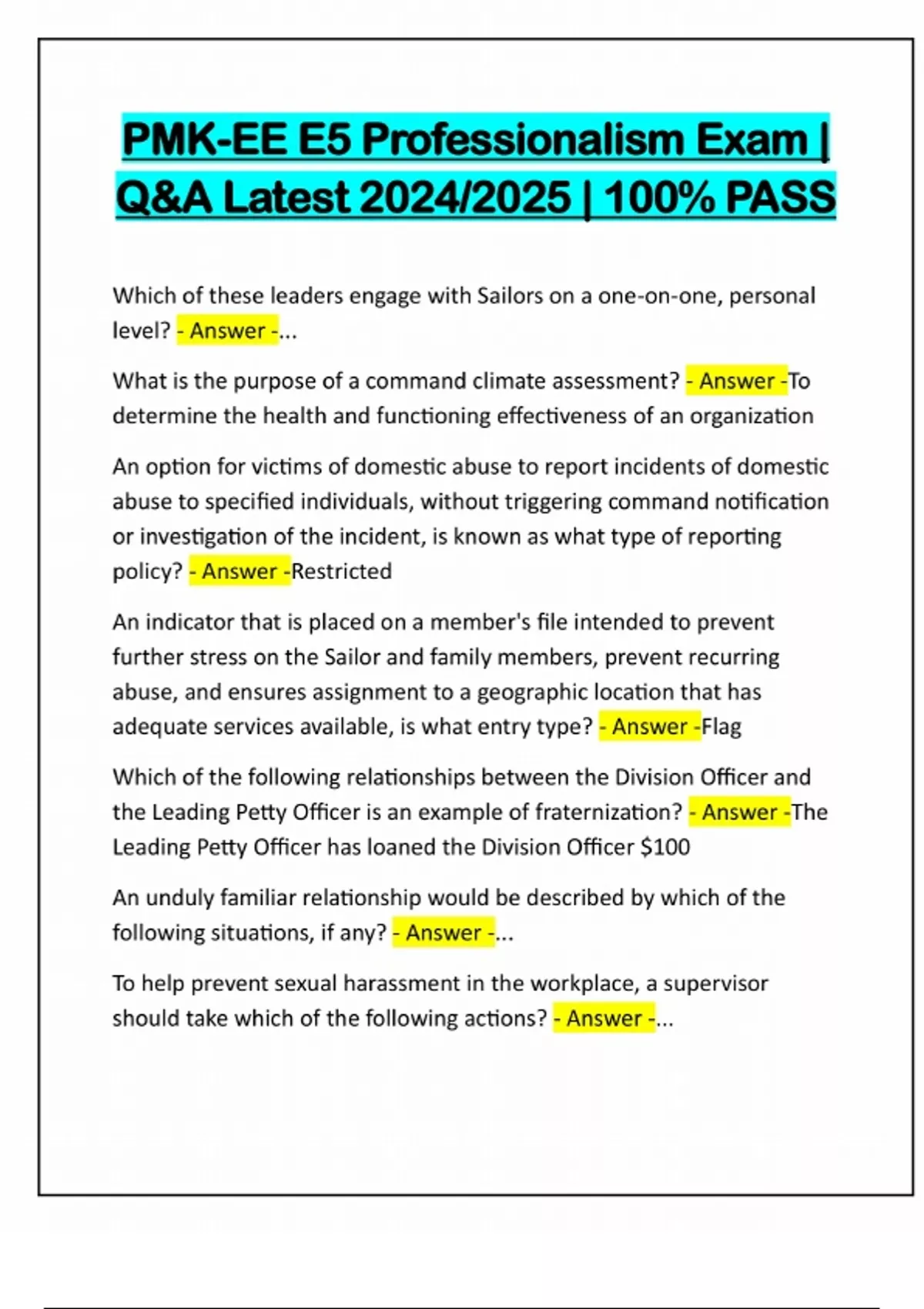 PMK-EE E5 PROFESSIONALISM EXAM ACTUAL 2025/2026 QUESTIONS AND 100% CORRECT ANSWERS Which of these leaders engage with Sailors on a one-on-one, personal level? - Answer -Deckplate leaders What is the purpose of a command climate assessment? - Answer -To determine the health and functioning eff