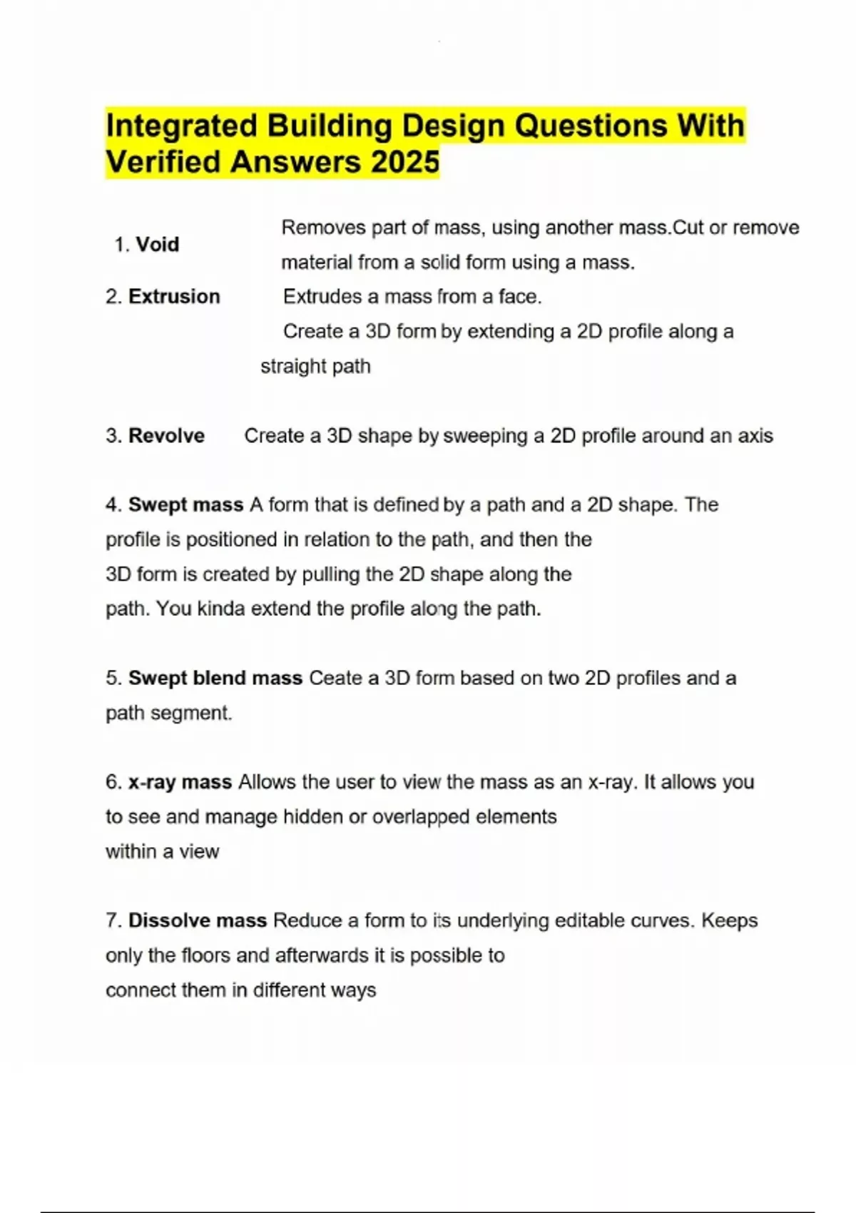 Integrated Building Design Questions With Verified Answers 2025 1. Void Removes part of mass, using another mass.Cut or remove material from a solid form using a mass. 2. Extrusion Extrudes a mass from a face. Create a 3D form by extending a 2D profile along a straight path 3. Revolve Create a 3D shape by sweeping a 2D profile around an axis 4. Swept mass A form that is defined by a path and a 2D shape. The profile is positioned in relation to the path, and then the 3D form is created by pulling the 2D shape along the path. You kinda extend the profile along the path. 5. Swept blend mass Ceate a 3D form based on two 2D profiles and a path segment. 6. x-ray mass Allows the user to view the mass as an x-ray. It allows you to see and manage hidden or overlapped elements within a view 7. Dissolve mass Reduce a form to its underlying editable curves. Keeps only the floors and afterwards it is possible to connect them in different ways