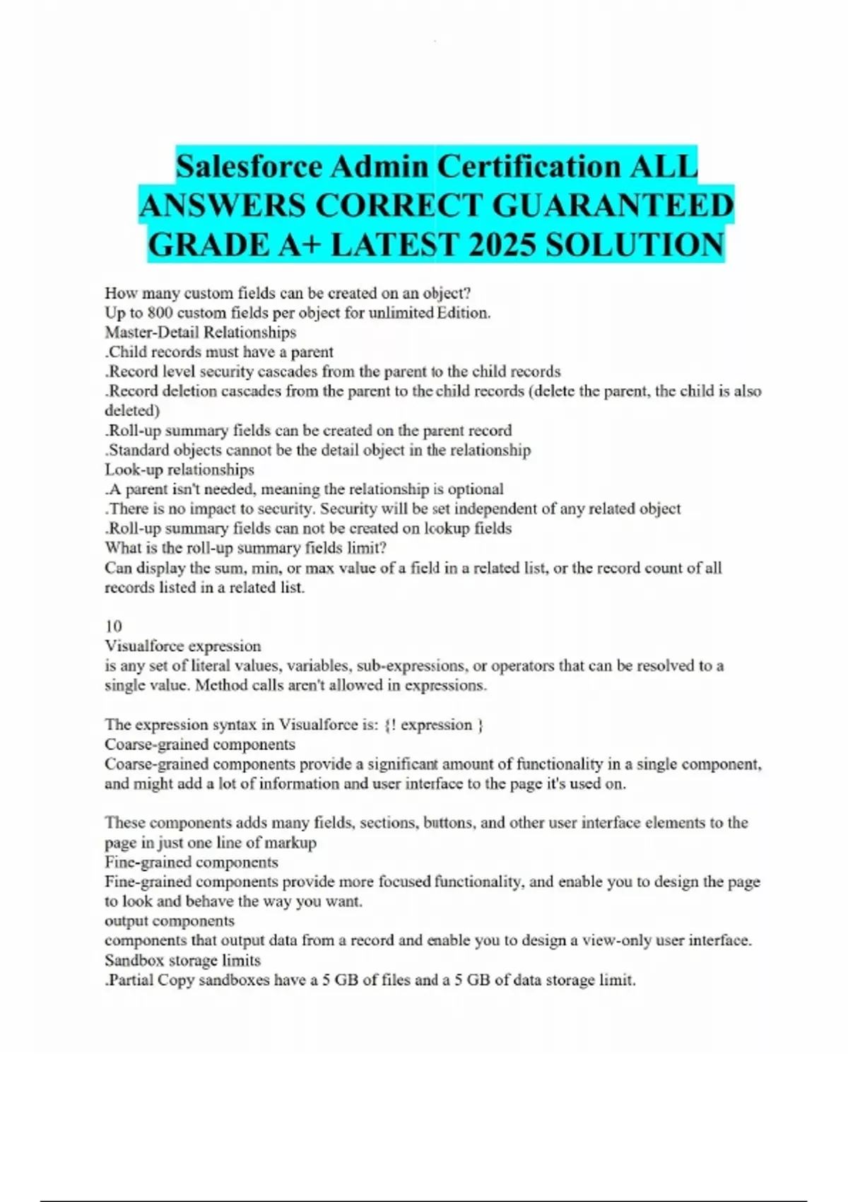 Salesforce Admin Certification ALL ANSWERS CORRECT GUARANTEED GRADE A+ LATEST 2025 SOLUTION How many custom fields can be created on an object? Up to 800 custom fields per object for unlimited Edition. Master-Detail Relationships .Child records must have a parent .Record level security cascades from the parent to the child records .Record deletion cascades from the parent to the child records (delete the parent, the child is also deleted) .Roll-up summary fields can be created on the parent record .Standard objects cannot be the detail object in the relationship Look-up relationships .A parent isn't needed, meaning the relationship is optional .There is no impact to security. Security will be set independent of any related object .Roll-up summary fields can not be created on lookup fields What is the roll-up summary fields limit? Can display the sum, min, or max value of a field in a related list, or the record count of all records listed in a related list. 10 Visualforce expression is any set of literal values, variables, sub-expressions, or operators that can be resolved to a single value. Method calls aren't allowed in expressions. The expression syntax in Visualforce is: {! expression } Coarse-grained components Coarse-grained components provide a significant amount of functionality in a single component, and might add a lot of information and user interface to the page it's used on. These components adds many fields, sections, buttons, and other user interface elements to the page in just one line of markup Fine-grained components Fine-grained components provide more focused functionality, and enable you to design the page to look and behave the way you want. output components components that output data from a record and enable you to design a view-only user interface. Sandbox storage limits .Partial Copy sandboxes have a 5 GB of files and a 5 GB of data storage limit. .Developer Pro sandboxes have a 1 GB of files and a 1 GB of data storage limit. .Developer sandboxes have a 200 MB of files and a 200 MB of data storage limit. .Full sandboxes have the same storage limit as your production organization. Standard List Controller The standard list controller allows you to create Visualforce pages that can display or act on a set of records. Adding the standard list controller to a page is very similar to adding the standard (record) controller, but with the intent of working with many records at once, instead of one record at a time. The standard (record) controller makes it easy to get a single record loaded into a variable you can use on a Visualforce page. The standard list controller is similar, except instead of a single record, it loads a list, or collection, of records into the variable. How do you emulate salesforce1 from your desktop browser? Add " one/" after your salesforce instance name in the URL. Limitations of dynamic dashboards by Edition Enterprise edition can have up to 5, Unlimited and Performance Edition can have up to 10 and Developer Edition up to 3. What is a controller? Controllers typically retrieve the data to be displayed in a Visualforce page, and contain code that executes in response to page actions, such as a button being clicked. The primary purpose of most controllers is to retrieve data for display, or handle updates to data. Describe the action types .Quick actions (New Account, New Event, New Task) .productivity action (Call) .standard buttons (Edit, Delete, Clone, Send an Email) .Chatter actions (Poll, Post) Apex triggers Apex triggers enable you to perform custom actions before or after events to records in Salesforce, such as insertions, updates, or deletions. Use triggers to perform tasks that can't be done by using the point-and-click tools (declarative) in the Salesforce user interface. There are two types of triggers. .Before triggers are used to update or validate record values before they're saved to the database. .After triggers are used to access field values that are set by the system (such as a record's Id or LastModifiedDate field), and to effect changes in other records. The records that fire the after trigger are read-only. What is the difference between and license? F is a PaaS product. It contains an application or Framework for you to build Apps onto. This license gives no access to leads, accounts or opportunities. You would have to build Apps, Tabs, Custom Objects, Workflow Rules all yourself to design the kind of system that you want to use. S is a SaaS with their three core products, Sales Cloud, Service Cloud and Marketing Cloud. When you purchase S Licenses for Sales Cloud, you get all of your normal tabs (Leads, Accounts etc) plus the ability to customise the whole platform using F! Who See What Org Access: Able to restrict access by IP address and login hours through profiles. At the org level, only IP addresses are set. Login hours are only set at the Profile level. Object Access: Determine through assigned profile. Record Access: Determine through role hierarchy. E.g. US regional manager can see data in the US region only. Field Access: Through field level security. Restricts field access (read/write/non) by profile. Standard profiles group, contact manager, professional edition have standard profiles only. Org Access through IP ranges IP ranges can be set at the company level. Users outside the IP ranges set at the Company level will be sent an activation code. IP ranges can be set at the profile level. Users outside the IP ranges set at the Profile level will be denied access. Login hours Login hours are set at the profile level only. Field level security only available in enterprise, unlimited and developer editions. Custom Object Tabs Allows you to create, read, update and delete the data records in your custom objects. Web Tabs displays any web URL in a tab within your Salesforce application. Visualforce Tabs display customer user-interface pages created Visualforce. Lightning Page Tab Lightning Page Tabs let you add