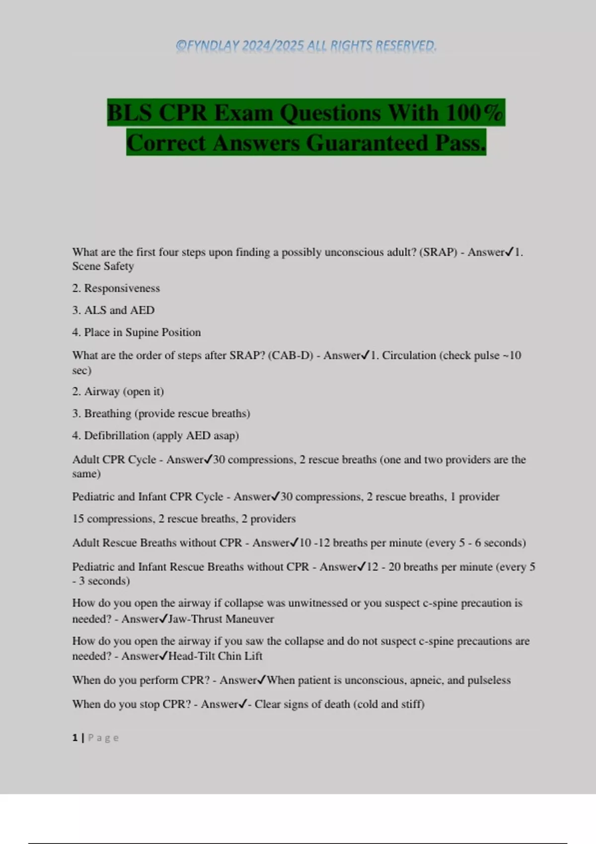 BLS CPR Exam Questions With 100% Correct Answers Guaranteed Pass. What are the first four steps upon finding a possibly unconscious adult? (SRAP) - Answer1. Scene Safety 2. Responsiveness 3. ALS and AED 4. Place in Supine Position What are the order of steps after SRAP? (CAB-D) - Answer1. Circulation (check pulse ~10 sec) 2. Airway (open it) 3. Breathing (provide rescue breaths) 4. Defibrillation (apply AED asap) Adult CPR Cycle - Answer30 compressions, 2 rescue breaths (one and two providers are the same) Pediatric and Infant CPR Cycle - Answer30 compressions, 2 rescue breaths, 1 provider 15 compressions, 2 rescue breaths, 2 providers Adult Rescue Breaths without CPR - Answer10 -12 breaths per minute (every 5 - 6 seconds) Pediatric and Infant Rescue Breaths without CPR - Answer12 - 20 breaths per minute (every 5 - 3 seconds) How do you open the airway if collapse was unwitnessed or you suspect c-spine precaution is needed? - AnswerJaw-Thrust Maneuver How do you open the airway if you saw the collapse and do not suspect c-spine precautions are needed? - AnswerHead-Tilt Chin Lift When do you perform CP