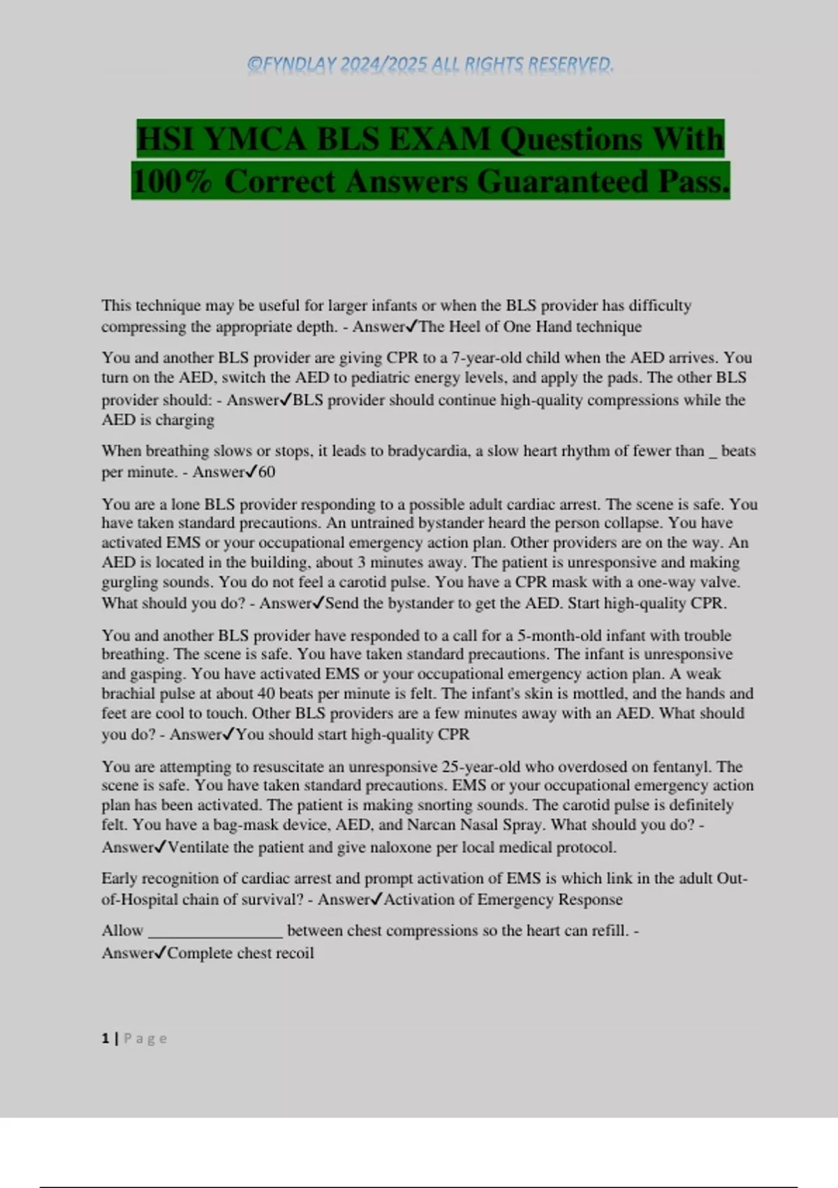 HSI YMCA BLS EXAM Questions With 100% Correct Answers Guaranteed Pass. This technique may be useful for larger infants or when the BLS provider has difficulty compressing the appropriate depth. - AnswerThe Heel of One Hand technique You and another BLS provider are giving CPR to a 7-year-old child when the AED arrives. You turn on the AED, switch the AED to pediatric energy levels, and apply the pads. The other BLS provider should: - AnswerBLS provider should continue high-quality compressions while the AED is charging When breathing slows or stops, it leads to bradycardia, a slow heart rhythm of fewer than _ beats per minute. - Answer60 You are a lone BLS provider responding to a possible adult cardiac arrest. The scene is safe. You have taken standard precautions. An untrained bystander heard the person collapse. You have activated EMS or your occupational emergency action plan. Other providers are on the way. An AED is located in the building, about 3 minutes away. The patient is unresponsive and making gurgling sounds. You do not feel a carotid pulse. You have a CPR mask with a one-way valve. What should you do? - AnswerSend the bystander to get the AED. Start high-quality CPR. You and another BLS provider have responded to a call for a 5-month-old infant with trouble breathing. The scene is safe. You have taken standard precautions. The infant is unresponsive and gasping. You have activated EMS or your occupational emergency action plan. A weak brachial pulse at about 40 beats per minute is felt. The infant's skin is mottled, and the hands and feet are cool to touch. Other BLS providers are a few minutes away with an AED. What should you do? - AnswerYou should start high-quality CPR You are attempting to resuscitate an unresponsive 25-year-old who overdosed on fentanyl. The scene is safe. You have taken standard precautions. EMS or your occupational emergency action plan has been activated. The patient is making snorting sounds. The carotid pulse is definitely felt. You have a bag-mask device, AED, and Narcan Nasal Spray. What should you do? - AnswerVentilate the patient and give naloxone per local medical protocol. Early recognition of cardiac arrest and prompt activation of EMS is which link in the adult Out- of-Hospital chain of survival? - AnswerActivation of Emergency Response Allow ________________ between chest compressions so the heart can refill. - AnswerComplete chest recoi