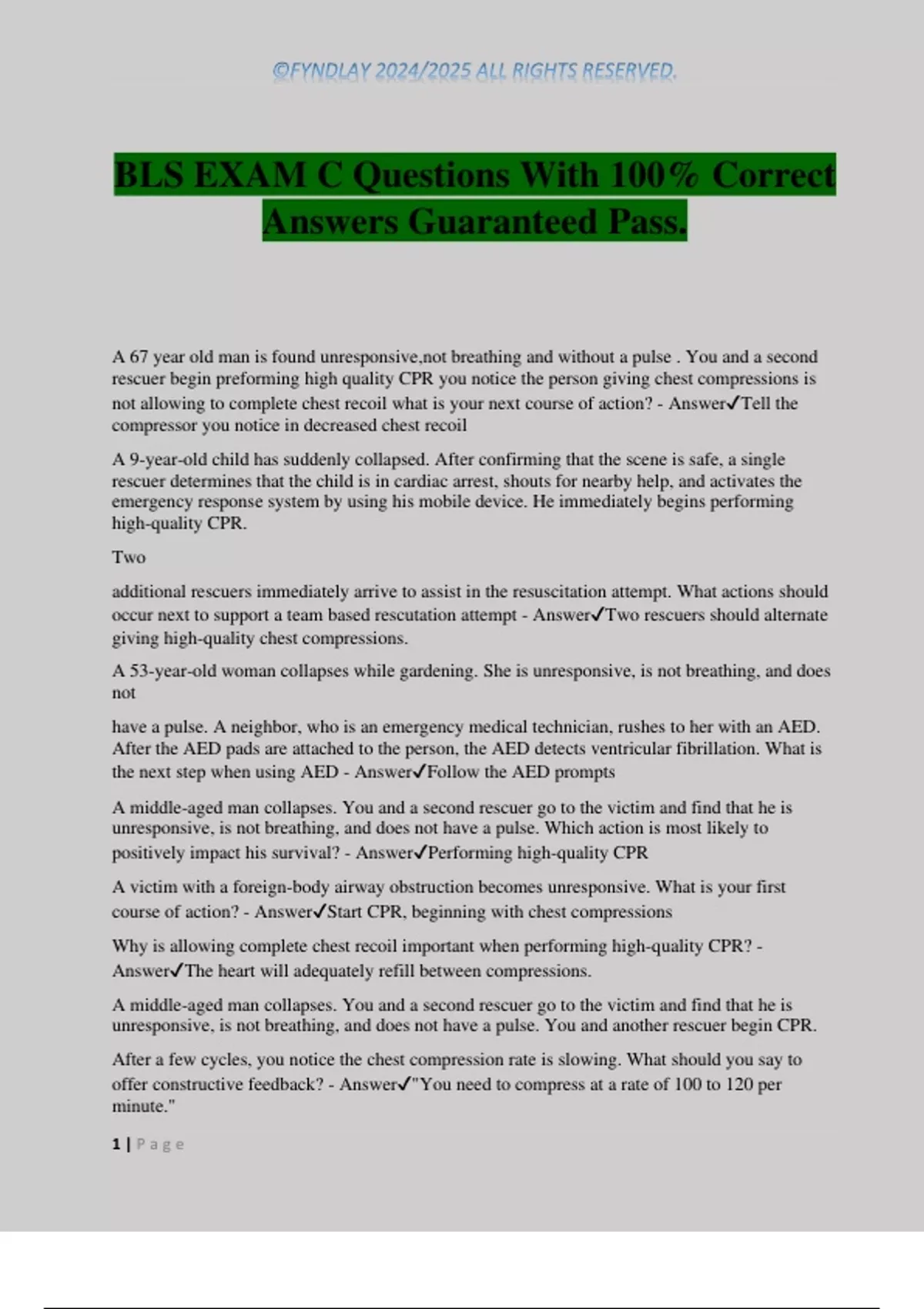BLS EXAM C Questions With 100% Correct Answers Guaranteed Pass. A 67 year old man is found unresponsive,not breathing and without a pulse . You and a second rescuer begin preforming high quality CPR you notice the person giving chest compressions is not allowing to complete chest recoil what is your next course of action? - AnswerTell the compressor you notice in decreased chest recoil A 9-year-old child has suddenly collapsed. After confirming that the scene is safe, a single rescuer determines that the child is in cardiac arrest, shouts for nearby help, and activates the emergency response system by using his mobile device. He immediately begins performing high-quality CPR. Two additional rescuers immediately arrive to assist in the resuscitation attempt. What actions should occur next to support a team based rescutation attempt - AnswerTwo rescuers should alternate giving high-quality chest compressions. A 53-year-old woman collapses while gardening. She is unresponsive, is not breathing, and does not have a pulse. A neighbor, who is an emergency medical technician, rushes to her with an AED. After the AED pads are attached to the person, the AED detects ventricular fibrillation. What is the next step when using AED - AnswerFollow the AED prompts A middle-aged man collapses. You and a second rescuer go to the victim and find that he is unresponsive, is not breathing, and does not have a pulse. Which action is most likely to positively impact his survival? - AnswerPerforming high-quality CPR A victim with a foreign-body airway obstruction becomes unresponsive. What is your first course of action? - AnswerStart CPR, beginning with chest compressions Why is allowing complete chest recoil important when performing high-quality CPR? - AnswerThe heart will adequately refill between compressions. A middle-aged man collapses. You and a second rescuer go to the victim and find that he is unresponsive, is not breathing, and does not have a pulse. You and another rescuer begin CPR. After a few cycles, you notice the chest compression rate is slowing. What should you say to offer constructive