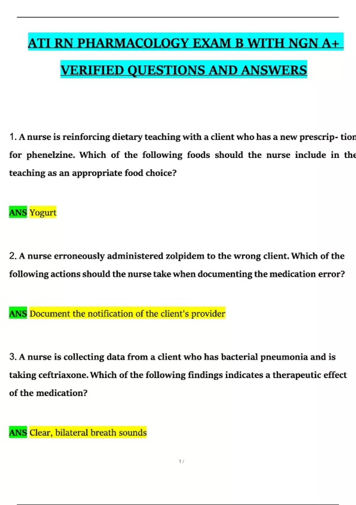 ATI RN PHARMACOLOGY EXAM B WITH A+ VERIFIED QUESTIONS AND ANSWERS ( V2 )