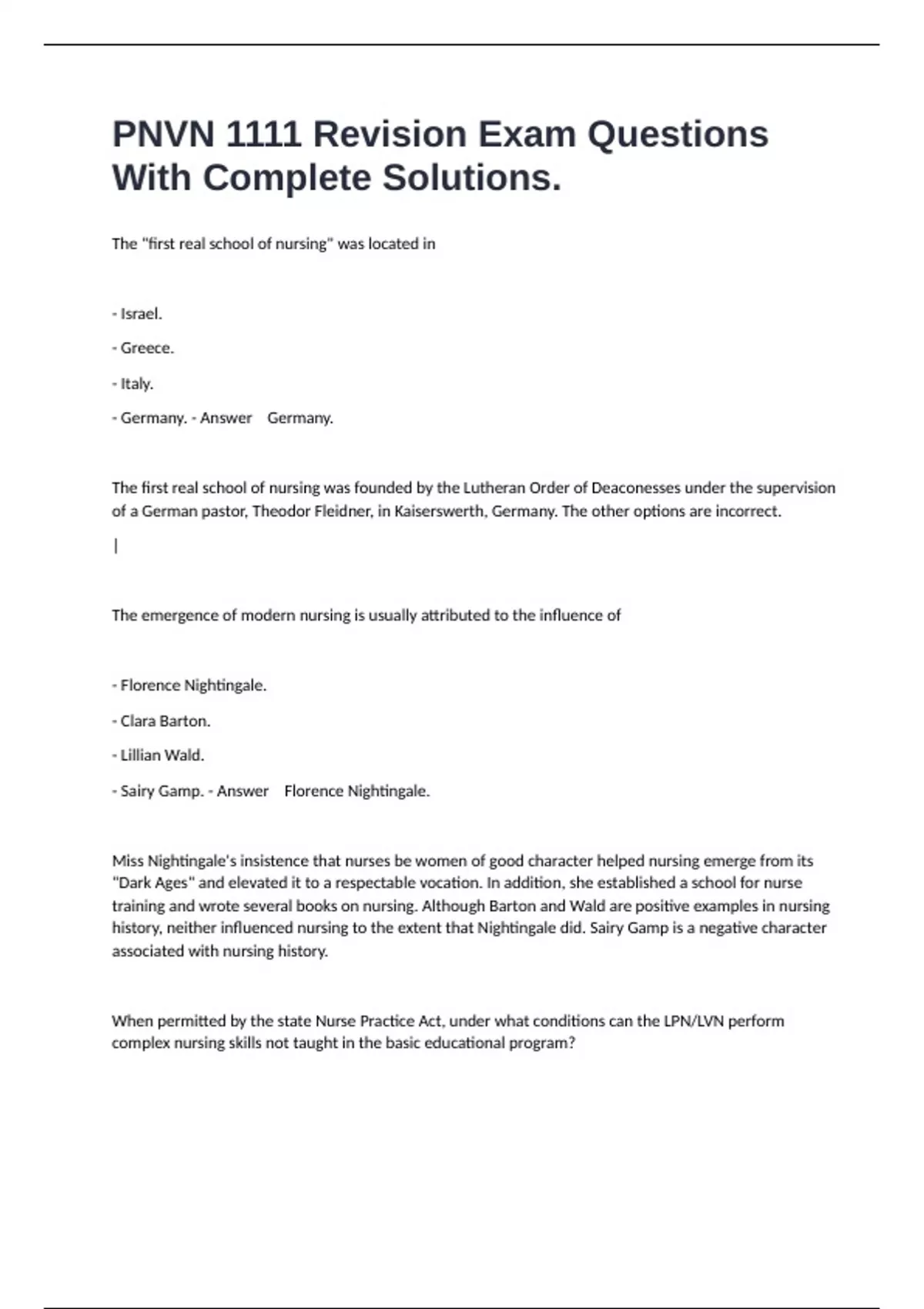 The "first real school of nursing" was located in - Israel. - Greece. - Italy. - Germany. - Answer Germany. The first real school of nursing was founded by the Lutheran Order of Deaconesses under the supervision of a German pastor, Theodor Fleidner, in Kaiserswerth, Germany. The other options are incorrect. | The emergence of modern nursing is usually attributed to the influence of - Florence Nightingale. - Clara Barton. - Lillian Wald. - Sairy Gamp. - Answer Florence Nightingale. Miss Nightingale's insistence that nurses be women of good character helped nursing emerge from its "Dark Ages" and elevated it to a respectable vocation. In addition, she established a school for nurse training and wrote several books on nursing. Although Barton and Wald are positive examples in nursing history, neither influenced nursing to the extent that Nightingale did. Sairy Gamp is a negative character associated with nursing history. When permitted by the state Nurse Practice Act, under what conditions can the LPN/LVN perform complex nursing skills not taught in the basic educational program?