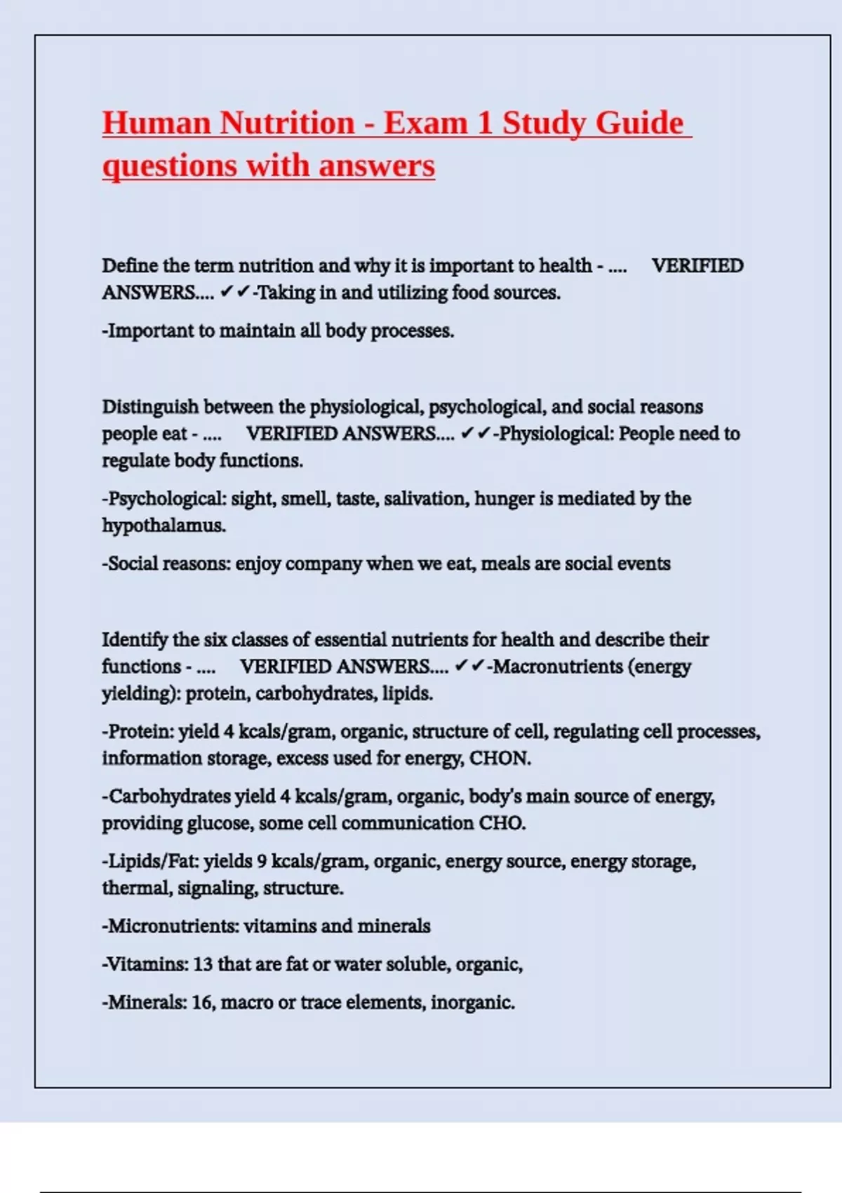 Human Nutrition - Exam 1 Study Guide questions with answers