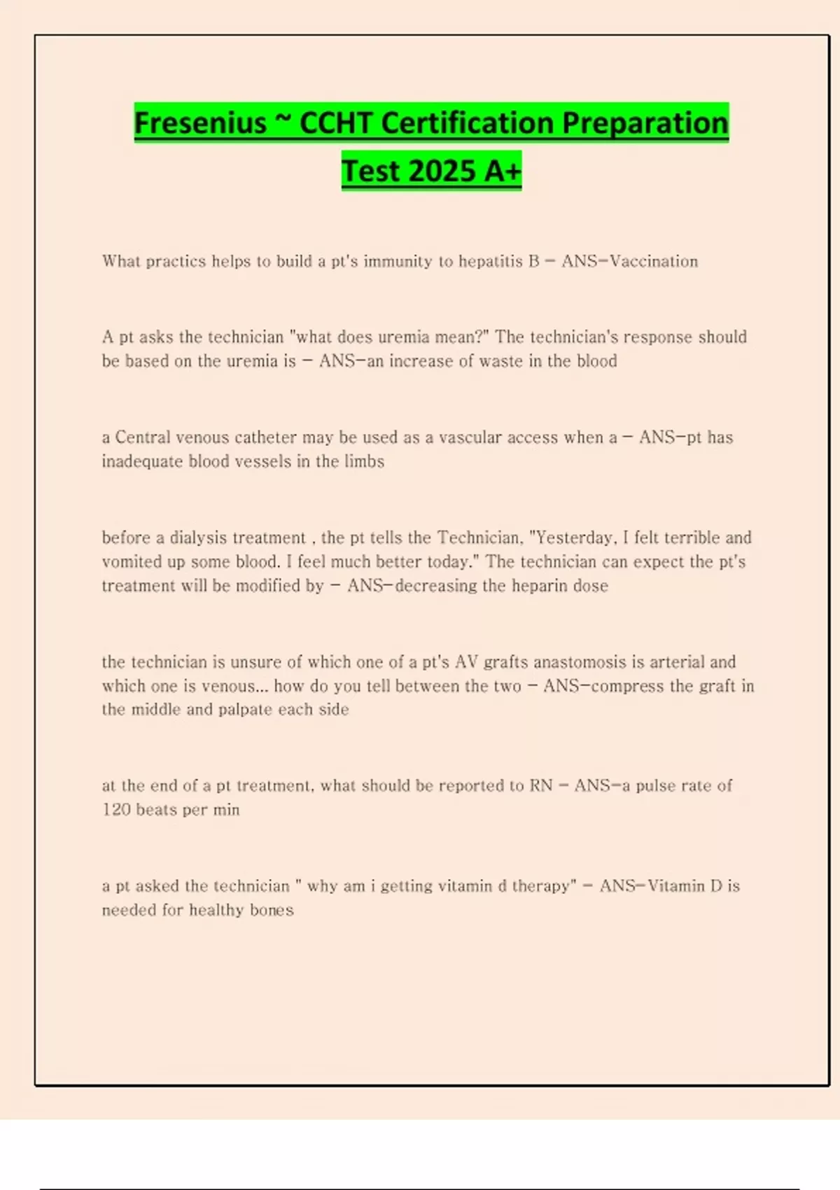 Fresenius ~ CCHT Certification Preparation Test 2025 A+
