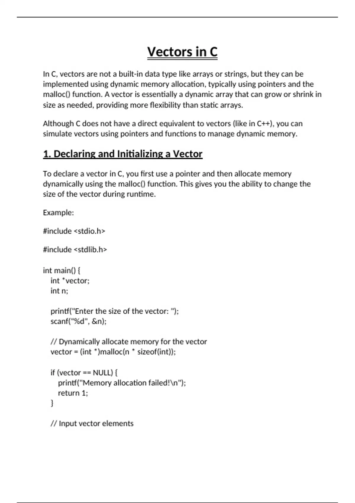 In this example, vector is a pointer to an integer, and we use malloc() to allocate