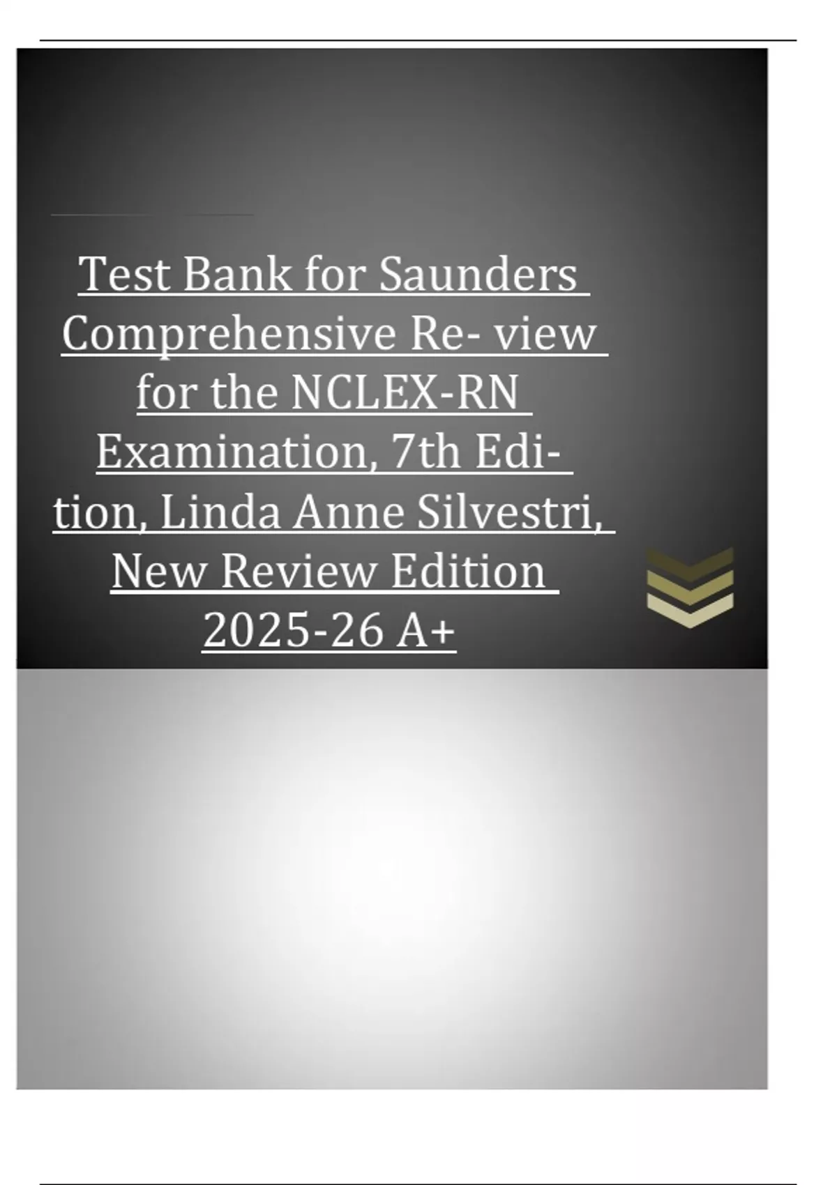Test Bank for Saunders Comprehensive Re- view for the NCLEX-RN Examination, 7th Edition, Linda Anne Silvestri, New Review Edition 2025-26 A+ MULTIPLE CHOICE 1. The nurse reviews the health record of a client with melasma. The nurse would anticipate that this client will exhibit: 1. Skin that is uniformly dark in color 2. Very pale skin with little pigmentation 3. Patches of skin that have loss of pigmentation 4. Blotchy brown macules across the cheeks and forehead ANS: 4 Rationale: Melasma is a condition caused by hormonal influences on melanin production and is noted by the appearance of blotchy brown macules across the cheeks and forehead. “Skin that is uniformly dark in color” describes vitiligo. “Very pale skin with little pigmentation” and “patches of skin that have loss of pigmentation” refer to normal variations in skin color. Test-Taking Strategy: To answer this question correctly, you must be familiar with the various terms used when discussing skin structures and functions. “Skin that is uniformly dark in color” describes vitiligo. “Very pale skin with little pigmentation” and “patches of skin that have loss of pigmentation” refer to normal variations in skin color. Review the description of melasma if you had difficulty with this question. PTS: 1 DIF: Level of Cognitive Ability: Understanding REF: Black, J., & Hawks, J. (2009). Medical-surgical nursing: clinical management for positive outcomes (8th ed.). St. Louis: Saunders. OBJ: Client Needs: Physiological Integrity TOP: Content Area: Adult Health/Integumentary MSC: Integrated Process: Nursing Process—Assessment 2. The client with cellulitis of the lower leg has had cultures done on the affected area. The nurse reviewing the results of the culture report interprets that which of the following organisms is not part of the normal flora of the skin? 1. Escherichia coli