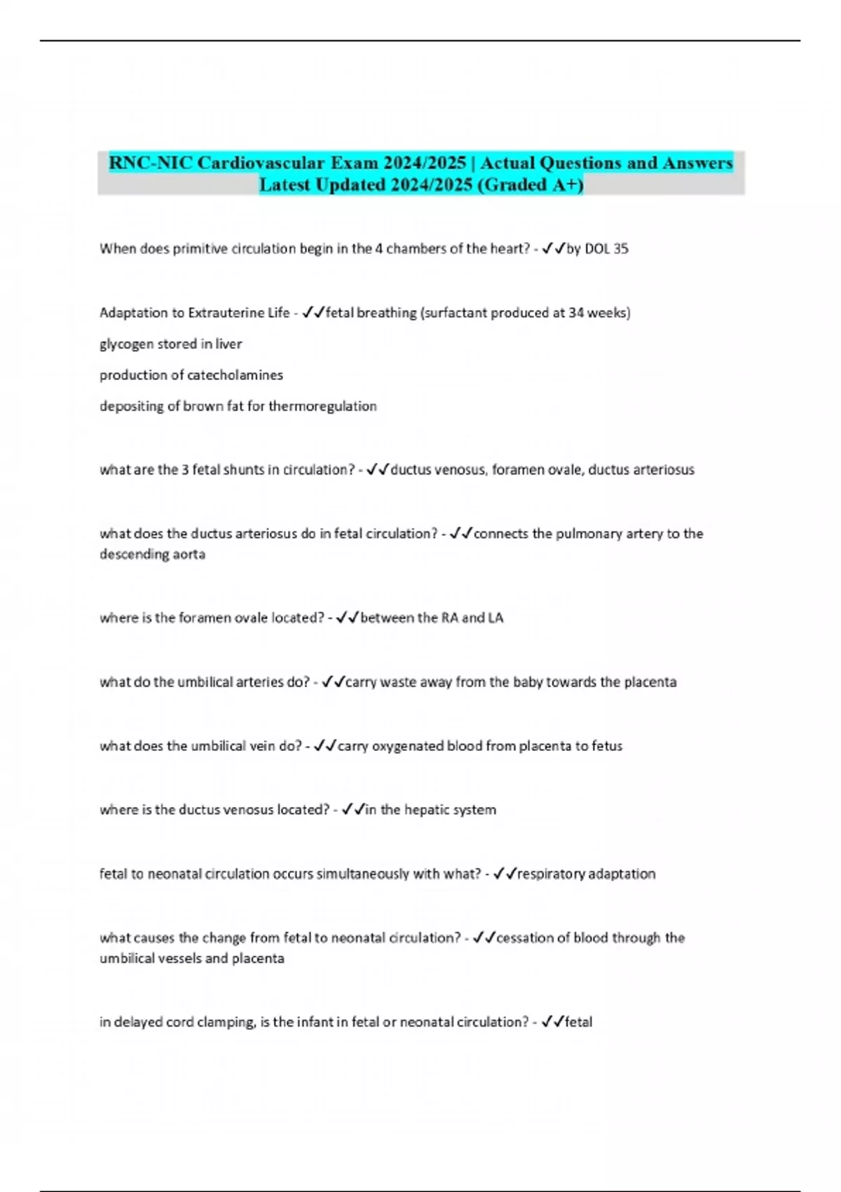 RNC-NIC Cardiovascular Exam 2024/2025 | Actual Questions and Answers