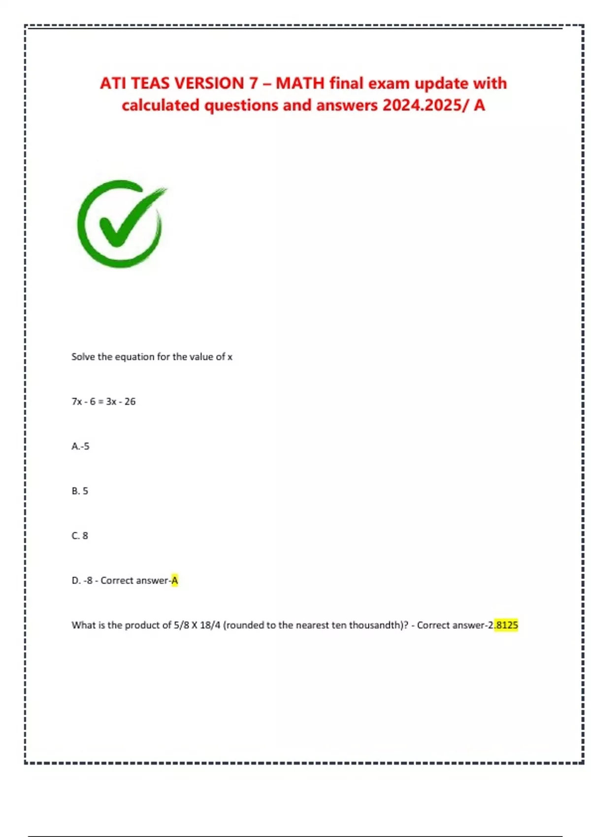 D. -8 - Correct answer-A