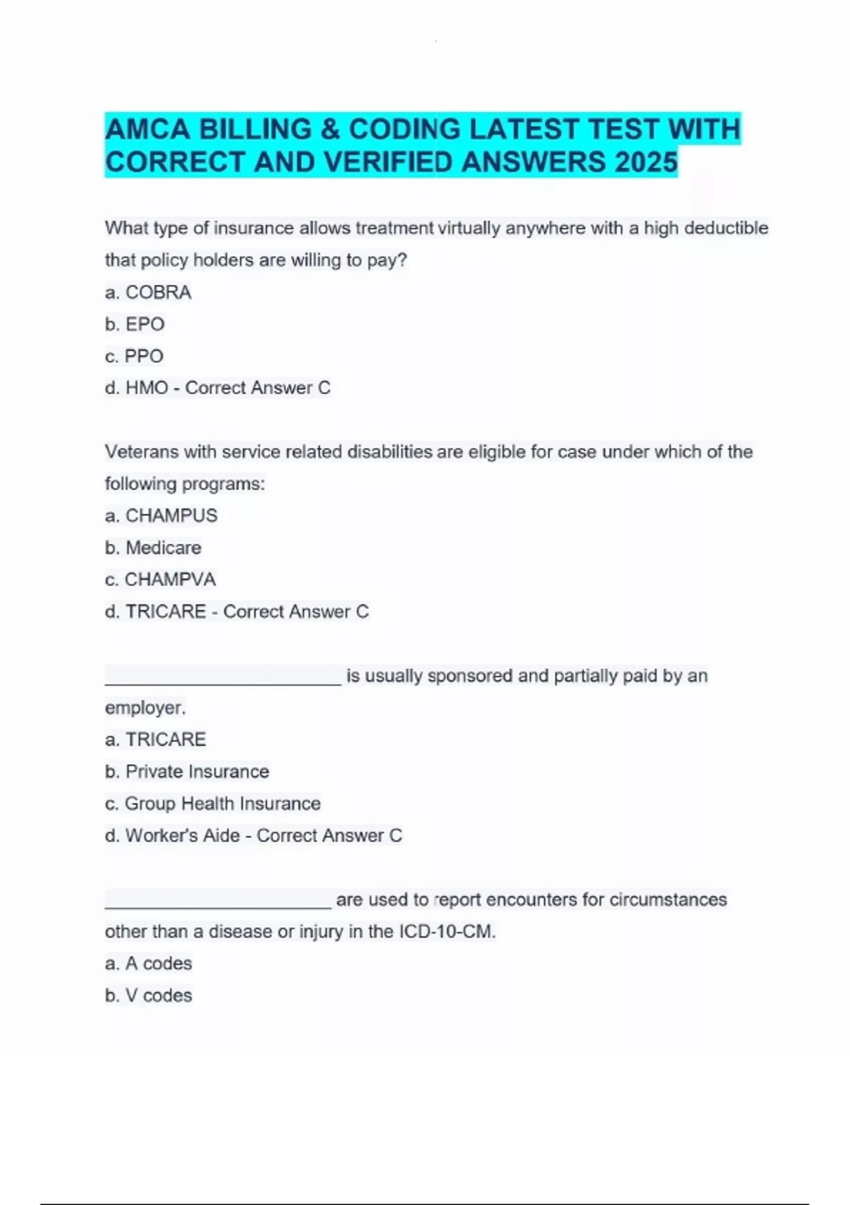 AMCA BILLING & CODING LATEST TEST WITH CORRECT AND VERIFIED ANSWERS 2025 What type of insurance allows treatment virtually anywhere with a high deductible that policy holders are willing to pay? a. COBRA b. EPO c. PPO d. HMO - Correct Answer C Veterans with service related disabilities are eligible for case under which of the following programs: a. CHAMPUS b. Medicare c. CHAMPVA d. TRICARE - Correct Answer C _______________________ is usually sponsored and partially paid by an employer. a. TRICARE b. Private Insurance c. Group Health Insurance d. Worker's Aide - Correct Answer C ______________________ are used to report encounters for circumstances other than a disease or injury in the ICD-10-CM. a. A codes b. V codes