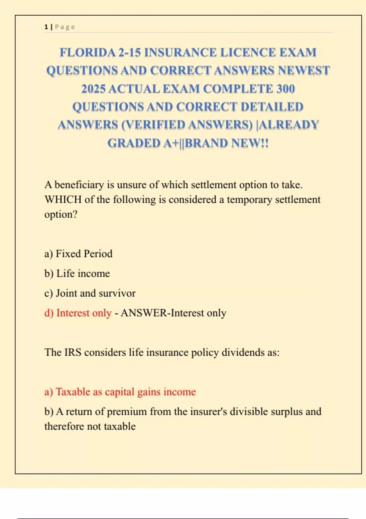 FLORIDA 2-15 INSURANCE LICENCE EXAM QUESTIONS AND CORRECT ANSWERS NEWEST 2025 ACTUAL EXAM COMPLETE 300 QUESTIONS AND CORRECT DETAILED ANSWERS (VERIFIED ANSWERS) |ALREADY GRADED A+||BRAND NEW!!
