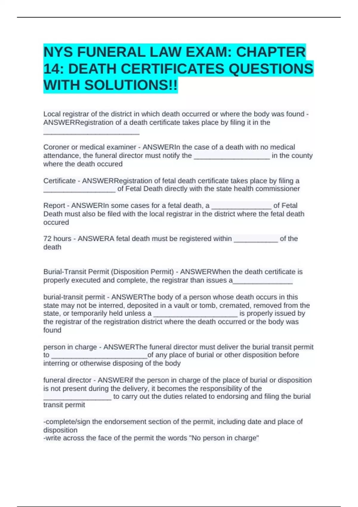 NYS FUNERAL LAW EXAM: CHAPTER 14: DEATH CERTIFICATES QUESTIONS WITH SOLUTIONS!!