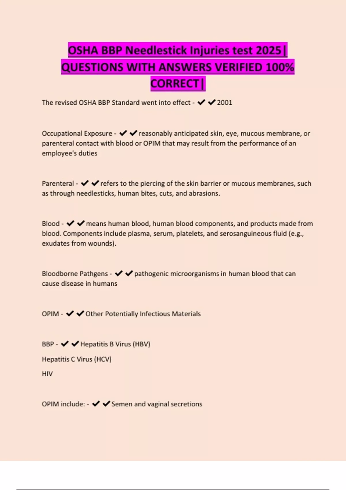 OSHA BBP Needlestick Injuries test 2025| QUESTIONS WITH ANSWERS VERIFIED 100% CORRECT|