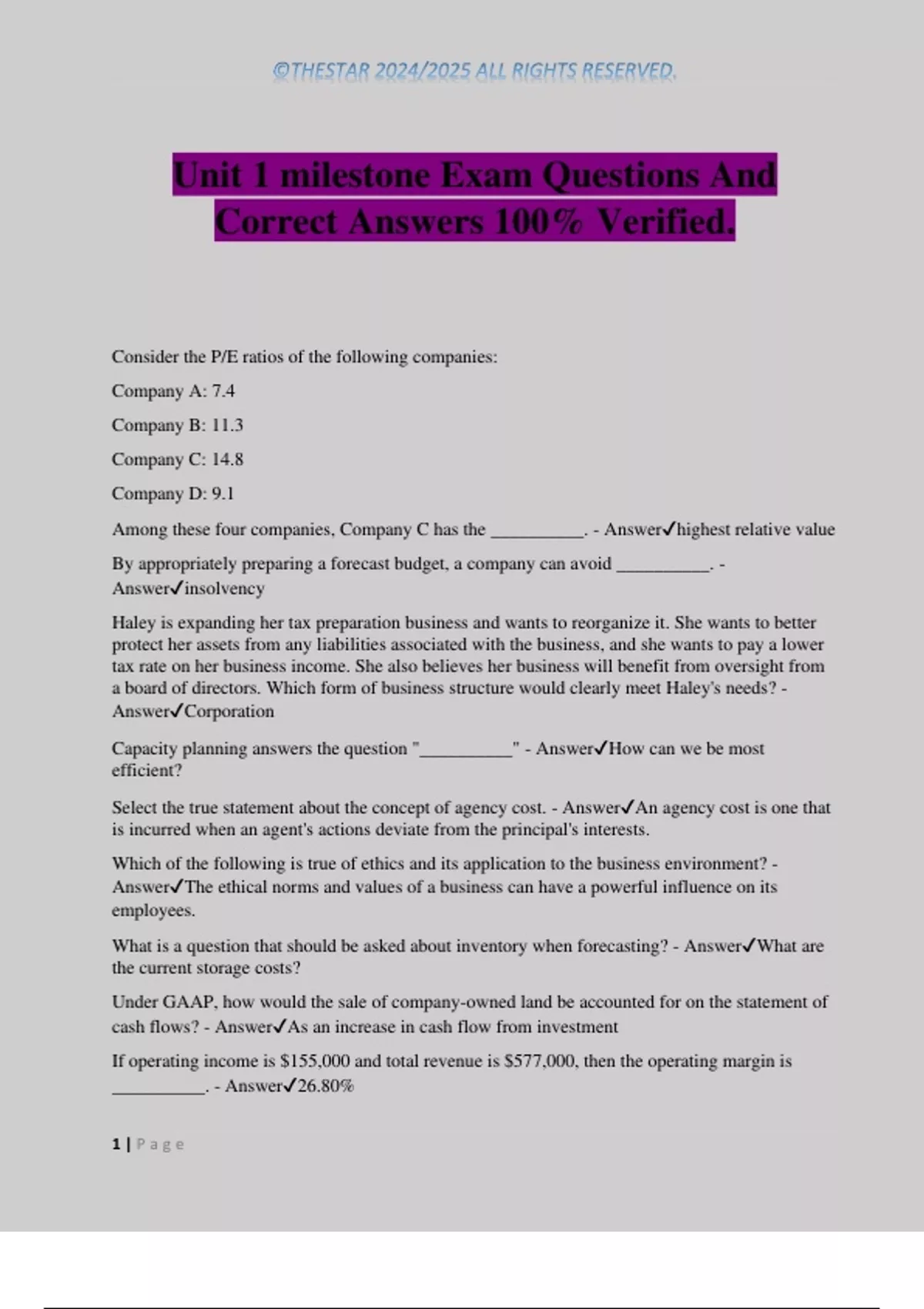 Unit 1 milestone Exam Questions And Correct Answers 100% Verified. Consider the P/E ratios of the following companies: Company A: 7.4 Company B: 11.3 Company C: 14.8 Company D: 9.1 Among these four companies, Company C has the __________. - Answerhighest relative value By appropriately preparing a forecast budget, a company can avoid __________. - Answerinsolvency Haley is expanding her tax preparation business and wants to reorganize it. She wants to better protect her assets from any liabilities associated with the business, and she wants to pay a lower tax rate on her business income. She also believes her business will benefit from oversight from a board of directors. Which form of business structure would clearly meet Haley's needs? - AnswerCorporation Capacity planning answers the question "__________" - AnswerHow can we be most efficient? Select the true statement about the concept of agency cost. - AnswerAn agency cost is one that is incurred when an agent's actions deviate from the principal's interests. Which of the following is true of ethics and its application to the business environment? - AnswerThe ethical norms and values of a business can have a powerful influence on its employees. What is a question that should be asked about inventory when forecasting? - AnswerWhat are the current storage costs? Under GAAP, how would the sale of company-owned land be accounted for on the statement of cash flows? - AnswerAs an increase in cash flow from investment If operating income is $155,000 and total revenue is $577,000, then the operating margin is __________. - Answer26