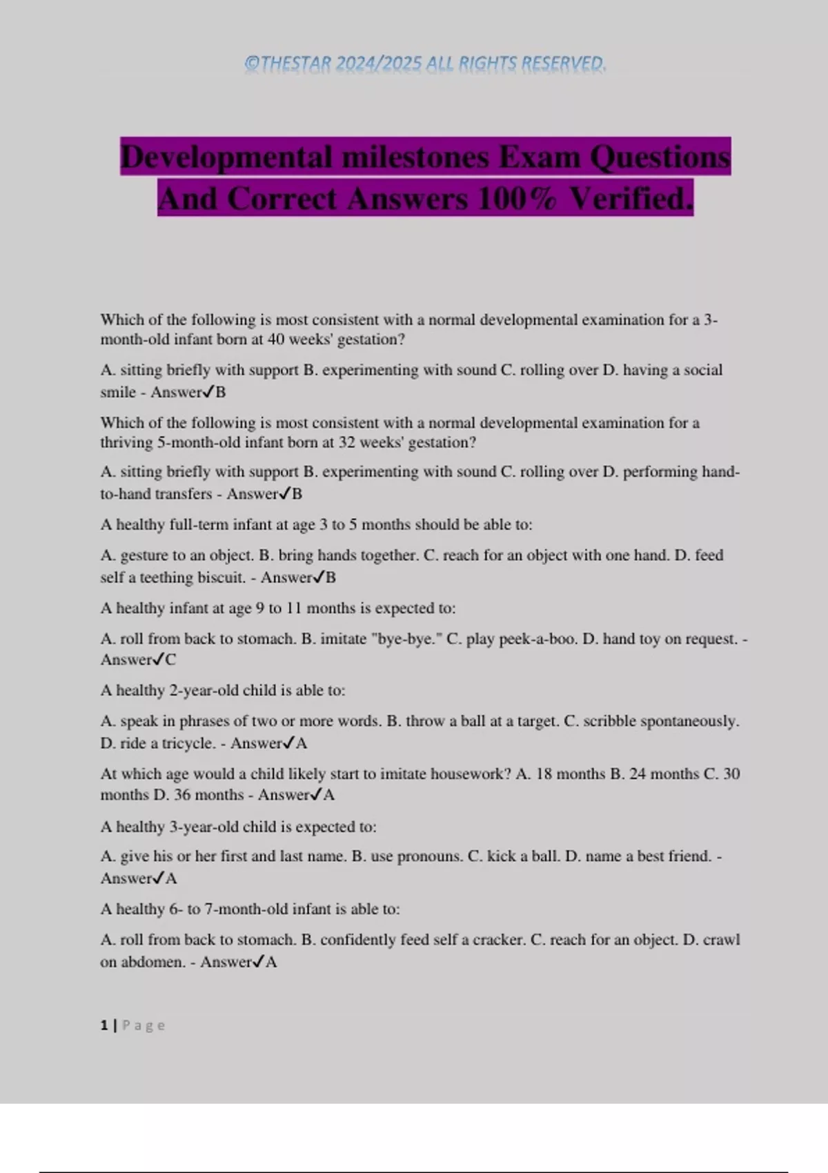 Developmental milestones Exam Questions