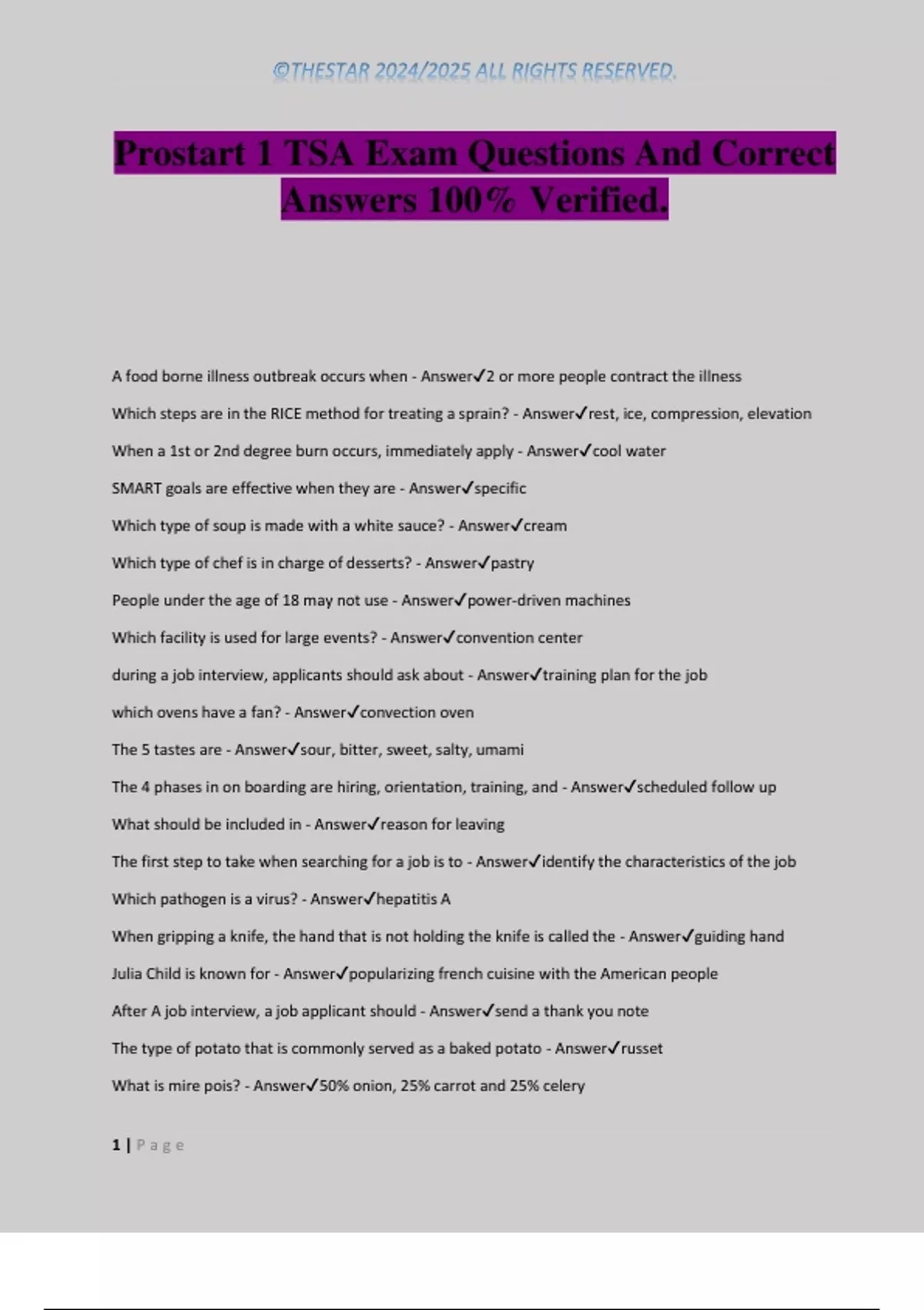 Prostart 1 TSA Exam Questions And Correct Answers 100% Verified. A food borne illness outbreak occurs when - Answer2 or more people contract the illness Which steps are in the RICE method for treating a sprain? - Answerrest, ice, compression, elevation When a 1st or 2nd degree burn occurs, immediately apply - Answercool water SMART goals are effective when they are - Answerspecific Which type of soup is made with a white sauce? - Answercream Which type of chef is in charge of desserts? - Answerpastry People under the age of 18 may not use - Answerpower-driven machines Which facility is used for large events? - Answerconvention center during a job interview, applicants should ask about - Answertraining plan for the job which ovens have a fan? - Answerconvection oven The 5 tastes are - Answersour, bitter, sweet, salty, umami The 4 phases in on boarding are hiring, orientation, training, and - Answerscheduled follow up What should be included in - Answerreason for leaving The first step to take when searching for a job is to - Answeridentify the characteristics of the job Which pathogen is a virus? - Answerhepatitis A When gripping a knife, the hand that is not holding the knife is called the - Answerguiding hand Julia Child is known for - Answerpopularizing french cuisine with the American people After A job interview, a job applicant should - Answersend a thank you note The type of potato that is commonly served as a baked potato - Answerrusset What is mire pois? - Answer50% onion, 25% carrot and 25% celery